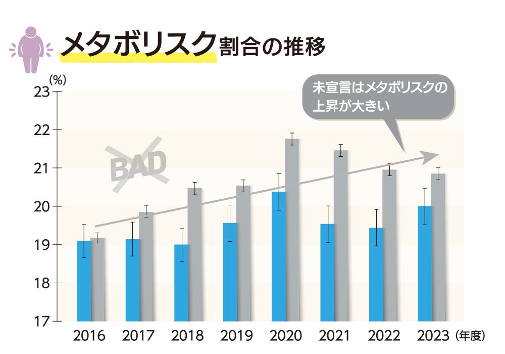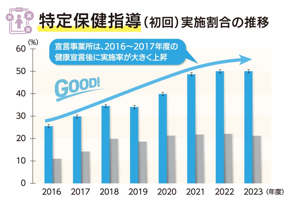 協会けんぽ京都支部が収集した2016~2023年度の健康データ(健康宣言事業所と未宣言事業所)の分析では、特定保健指導と関連する指標に顕著な差が出ています。