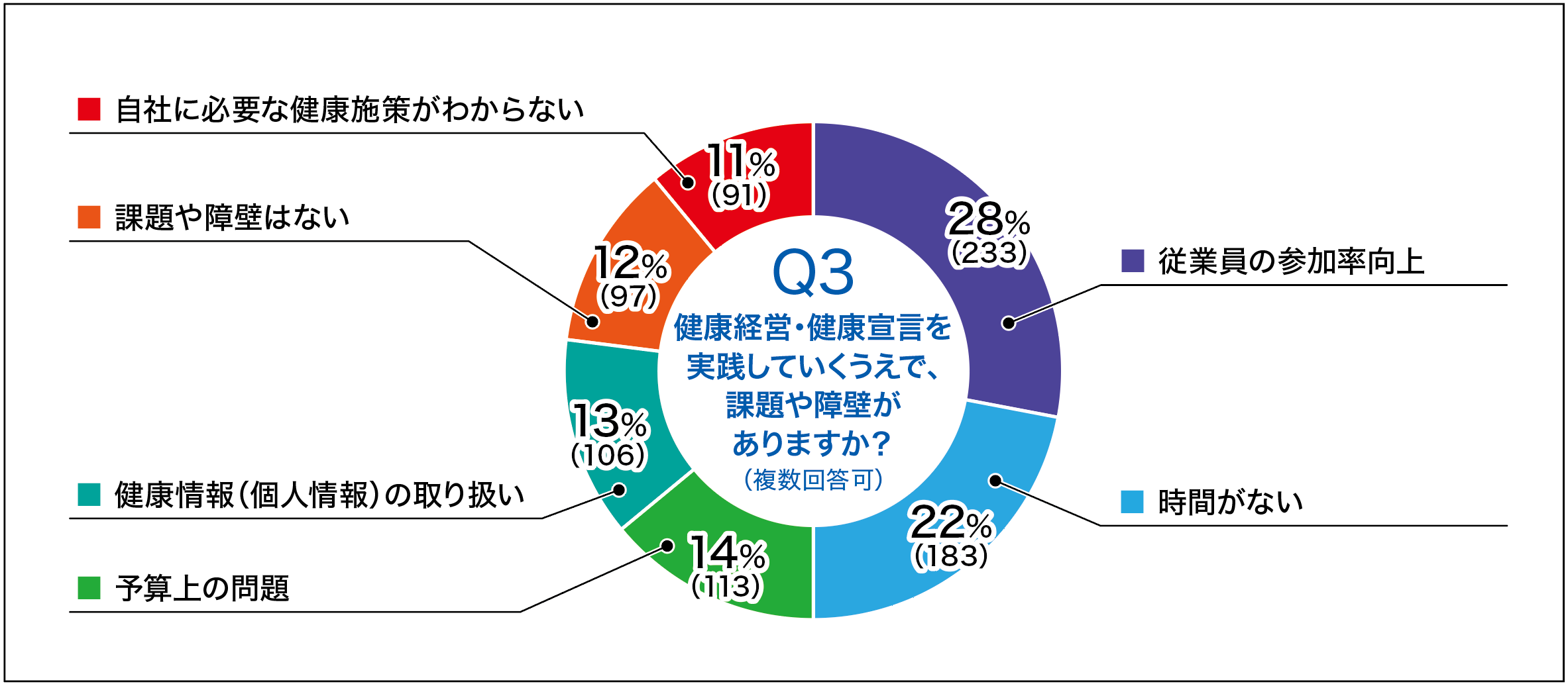 また、健康経営を実践していくうえでの課題や障壁については、「従業員の参加率向上(28%)」、「時間がない(22%)」が多くを占めています(Q3)。