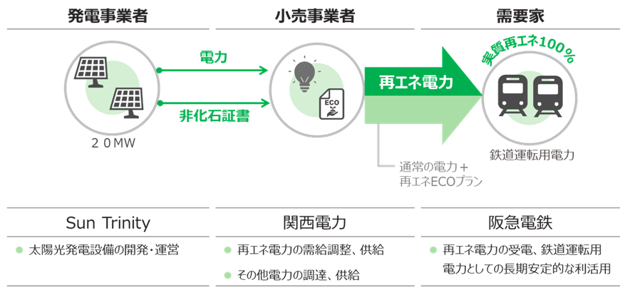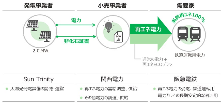 住友商事株式会社および四国電力株式会社が出資するSun Trinity合同会社(本社:東京都千代田区、社長:樫原 俊樹、以下「Sun Trinity」)は、阪急電鉄株式会社(本社:大阪市北区、代表取締役社長:嶋田 泰夫、以下「阪急電鉄」)を最終需要家、関西電力株式会社(本社:大阪市北区、取締役代表執行役社長:森 望、以下「関西電力」)を小売電気事業者、Sun Trinityを発電事業者とするオフサイト型フィジカルコーポレートPPA※1契約を締結しました(以下、「本事業」)。