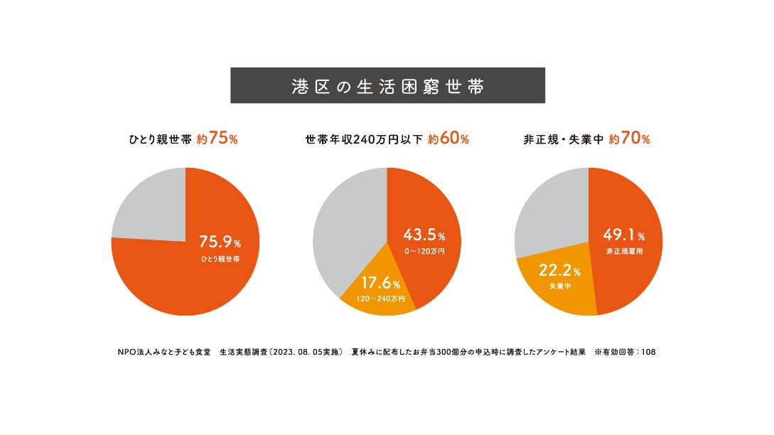 東京都港区の平均世帯年収は1,396万円(2023年*1)と高水準にありますが、生活困窮世帯も存在します。NPO法人みなと子ども食堂が支援している世帯へのアンケート(*2)によると、約75%がひとり親世帯であり、約70%が非正規雇用または失業中、約60%が年収240万円以下という厳しい現実があります。また、知的障がい者の多くは最低賃金のおよそ4分の1にあたる平均時給243円(2022年*3)で働いているのが現状であり、プロジェクトパートナーである港区内の障がい者施設、みなとワークアクティも例外ではありません。こうした普段の生活のなかでは見えにくい課題に対し、地域社会に根差した持続的な支援モデルとして取り組んでいます。