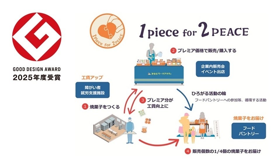 2025年10月15日、シクミオ株式会社(所在地:東京都港区、代表取締役:水上太郎)と東京都済生会中央病院(所在地:東京都港区、院長:海老原全)が推進する「1piece for 2PEACE. プロジェクト」は、2025年度グッドデザイン賞(主催:公益財団法人日本デザイン振興会)を受賞しました。障がい者が自ら支援の担い手となり、地域の子ども食堂を支える循環型の仕組みが評価され、ソーシャルインクルージョン(社会的包摂)の理念を実践するデザインとして認められました。