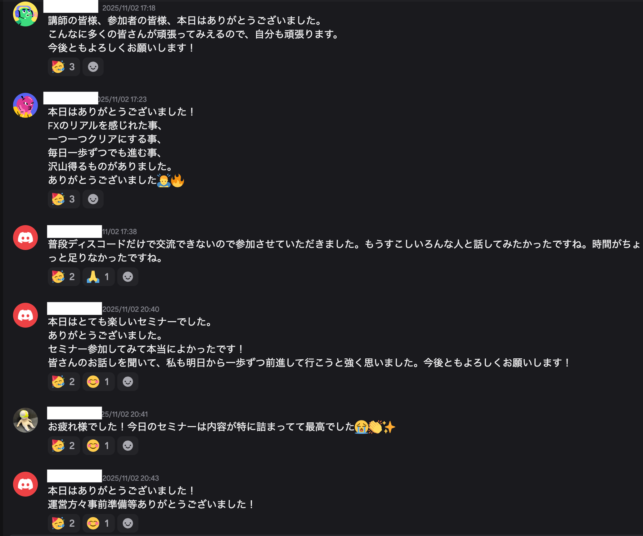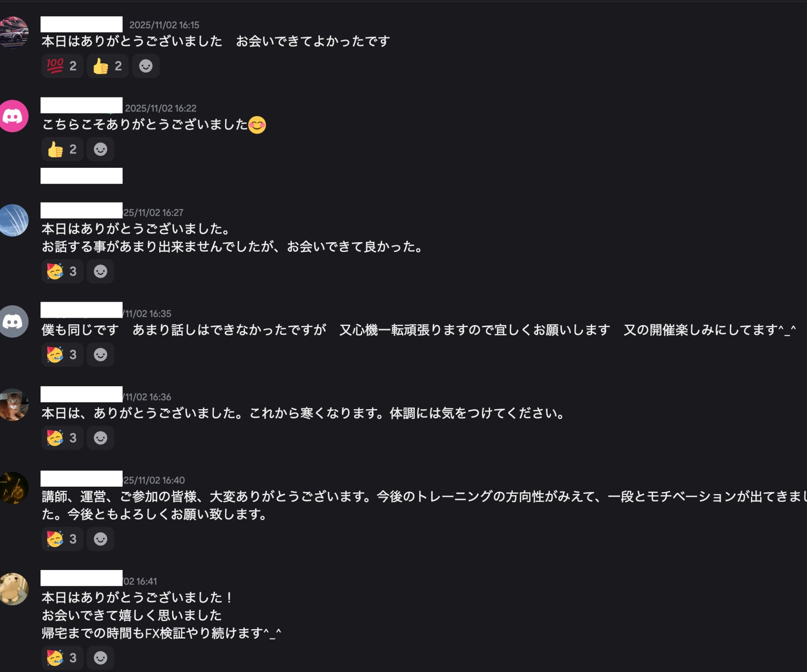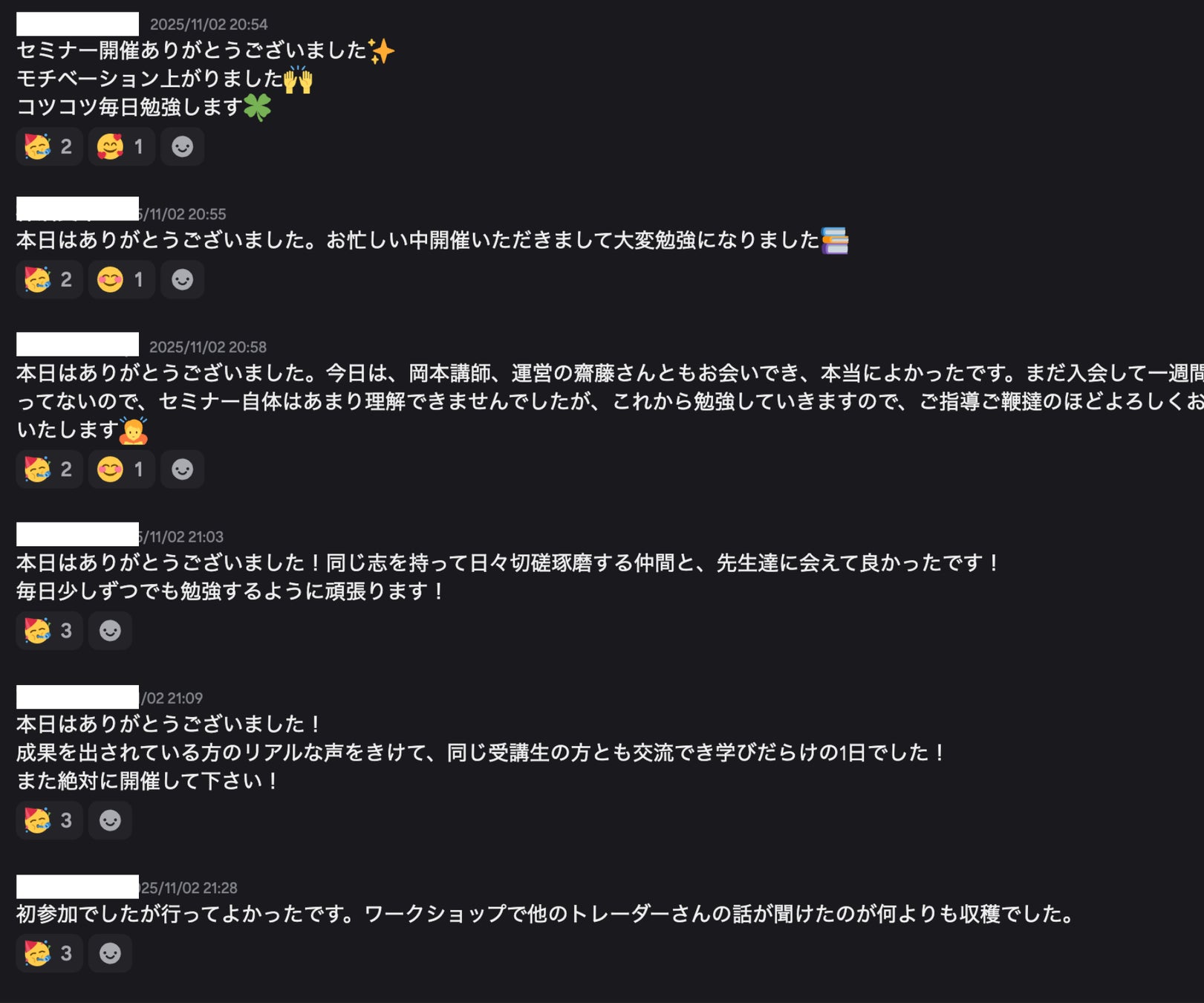 本セミナーでは、講師陣によるトレード実践解説や質疑応答、受講生同士の交流会など、
