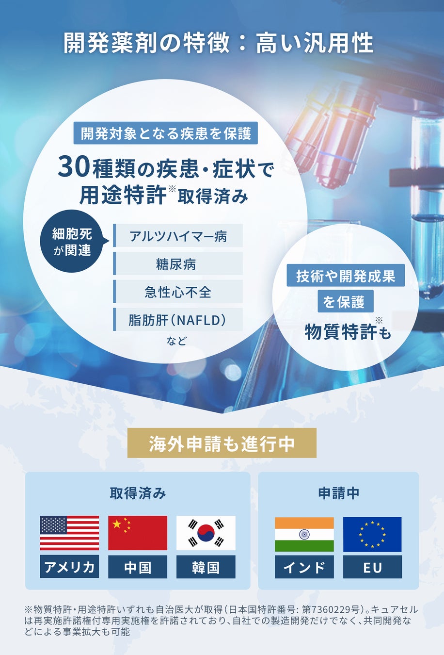※特許は自治医大が取得(日本国特許番号: 第7360229号)し、キュアセル社は再実施許諾権付専用実施権を許諾されております。これにより、自社での製造開発だけでなく、共同開発などによる事業拡大も可能となっております。