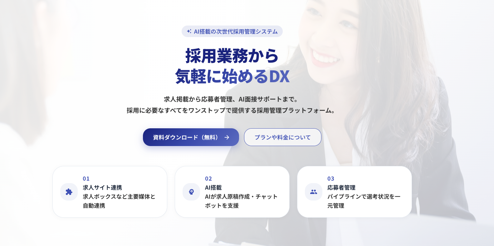 「採用業務から気軽に始めるDX」をコンセプトに、AI×採用で、採用管理に必要な機能をまとめて搭載した次世代ATSです。