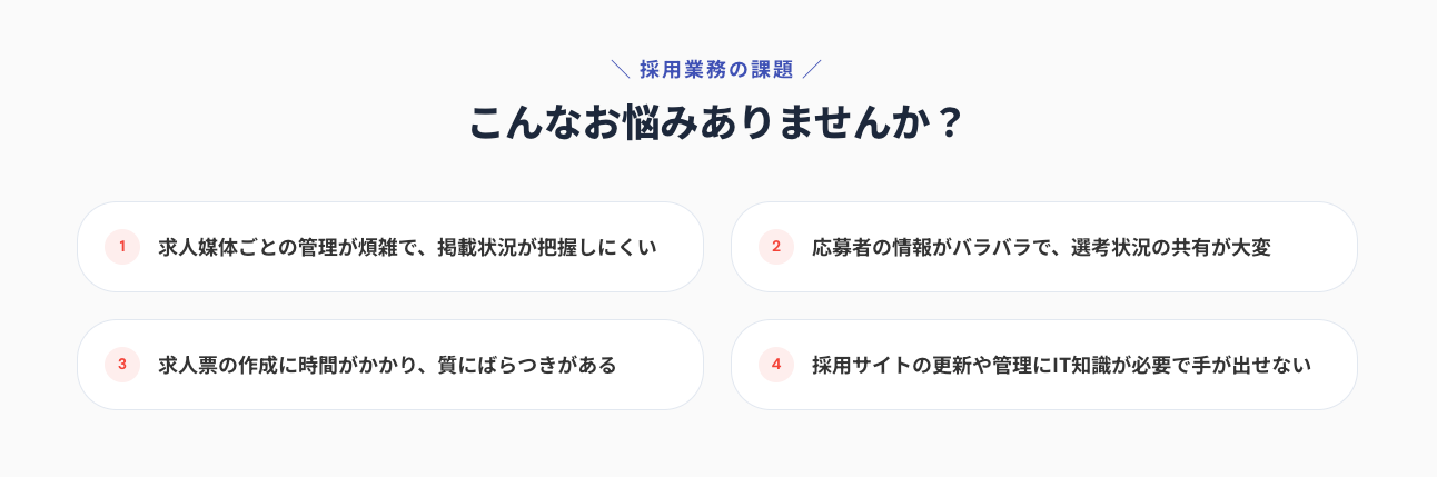 採用市場の変化により、採用担当者にはスピードと品質の両立が求められています。一方で現場では、媒体ごとの管理画面での更新、求人票の転記、掲載状況の確認、応募者対応の履歴管理など、運用タスクが増え続けています。