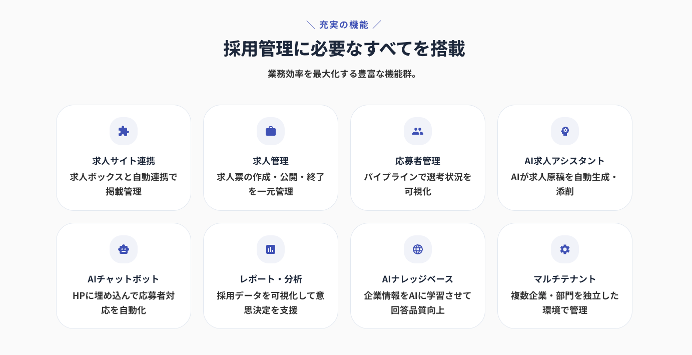 求人サイト連携により求人データと掲載状況を一括管理し、応募者の進捗はパイプラインで可視化。さらにAI求人アシスタントにより、求人票作成・改善の業務も支援し、採用活動を“回る仕組み”へ進化させます。