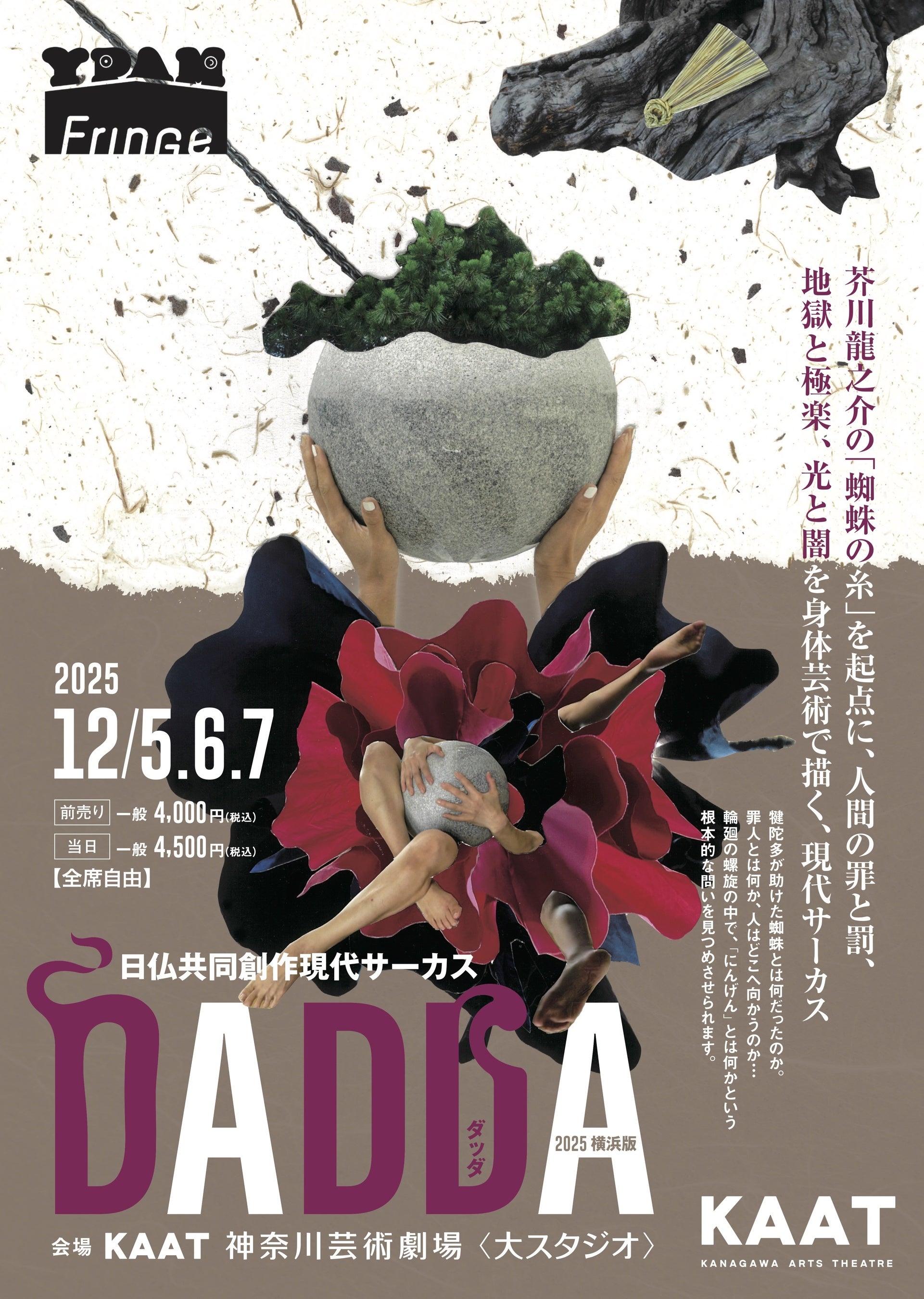 「善」と「悪」の境界とは?──人間の性(さが)と救済を、言葉なき身体の軌跡で描く現代サーカス作品『DADDA』。2027年春の完成を目指す本作が、KAAT神奈川芸術劇場にてワークインプログレス版として初公開されます。芥川龍之介「蜘蛛の糸」をテーマに、観る者の胸に問いを投げかける3日間。日仏共同制作による「見たことのない世界」が、横浜に立ち上がります。