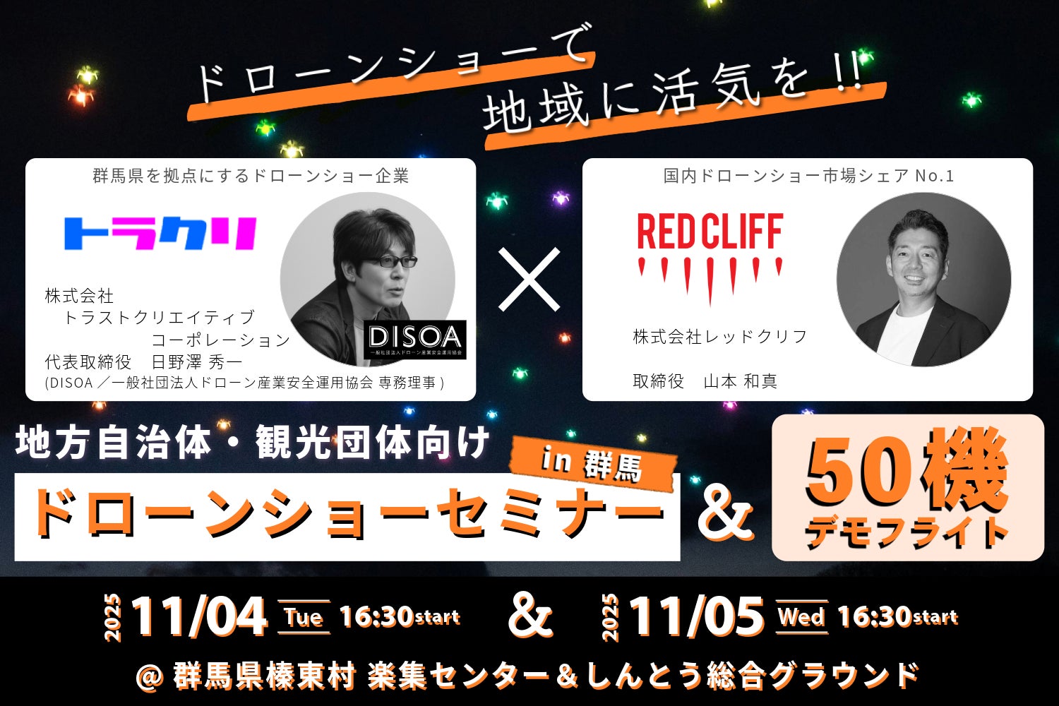 「群馬県実証フィールド活用事業」地方自治体・観光協会・商工団体向けに「ドローンショーリアルセミナーin群馬」を開催!ドローンショーの裏話や少数機50機でのショーも実施予定!