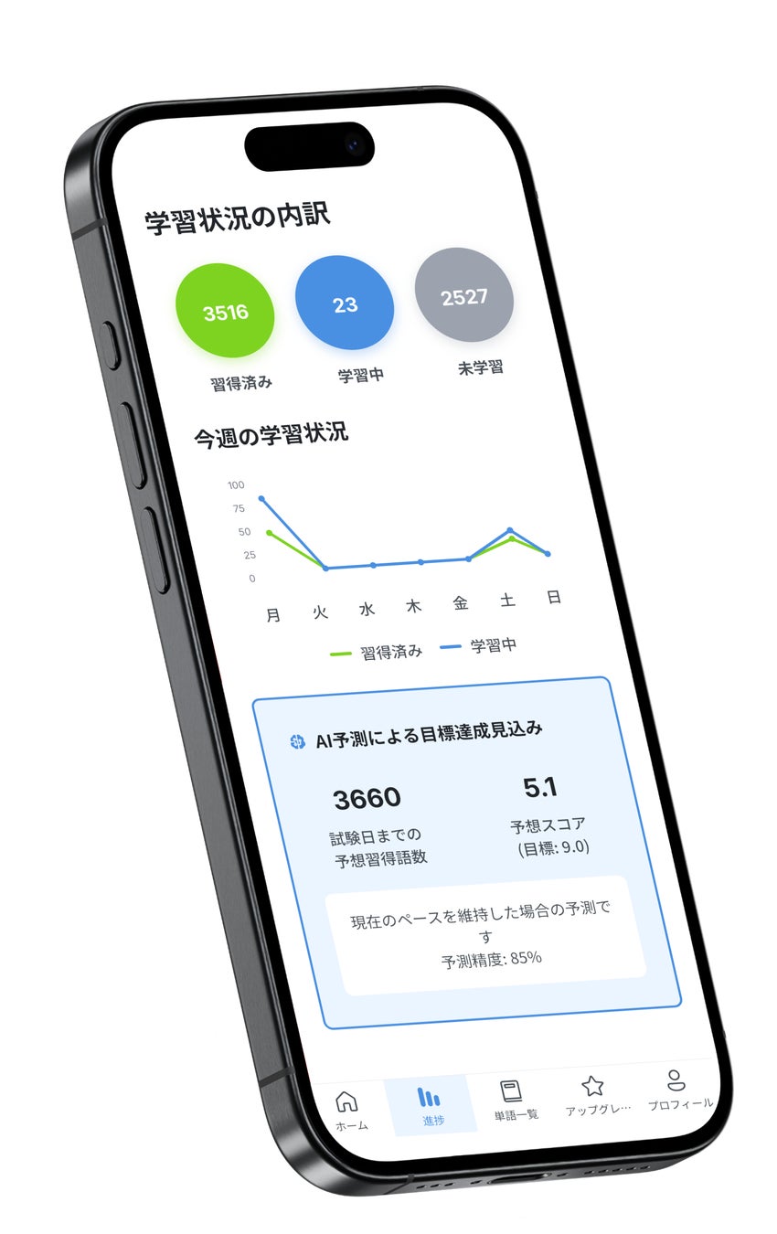 試験日までに習得できる予想単語数と予想スコアをAIが算出。「あと何語で目標達成できるか」が一目でわかるため、学習のモチベーション維持に貢献します。学習進捗は美しいグラフで可視化され、成長実感を得られます。