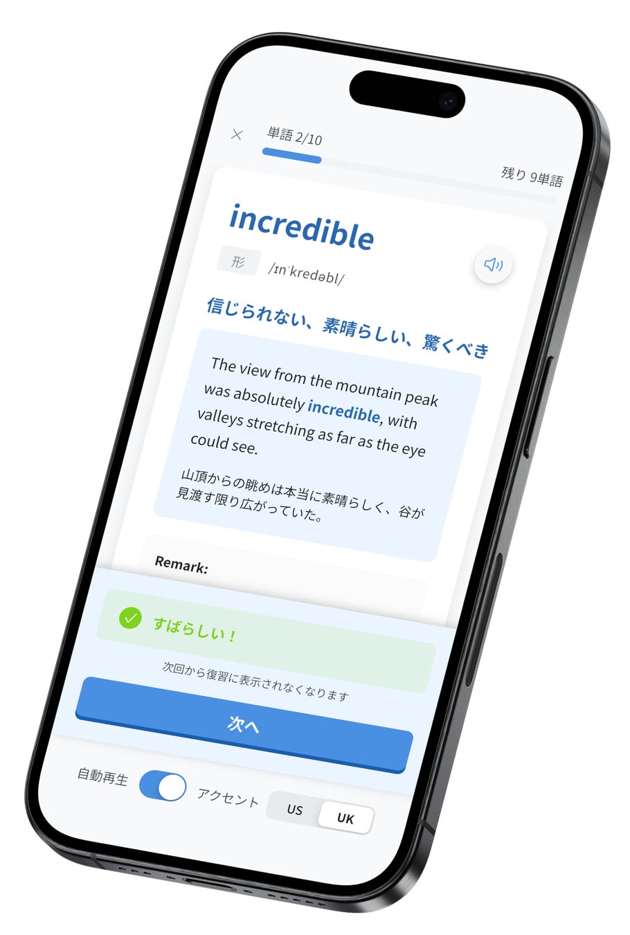 全単語にアメリカ英語・イギリス英語の両方のネイティブ音声を収録。発音記号と音声を組み合わせた学習で、「聞く・話す」力も同時に強化できます。自動再生機能により、通勤中の聞き流し学習にも対応しています。