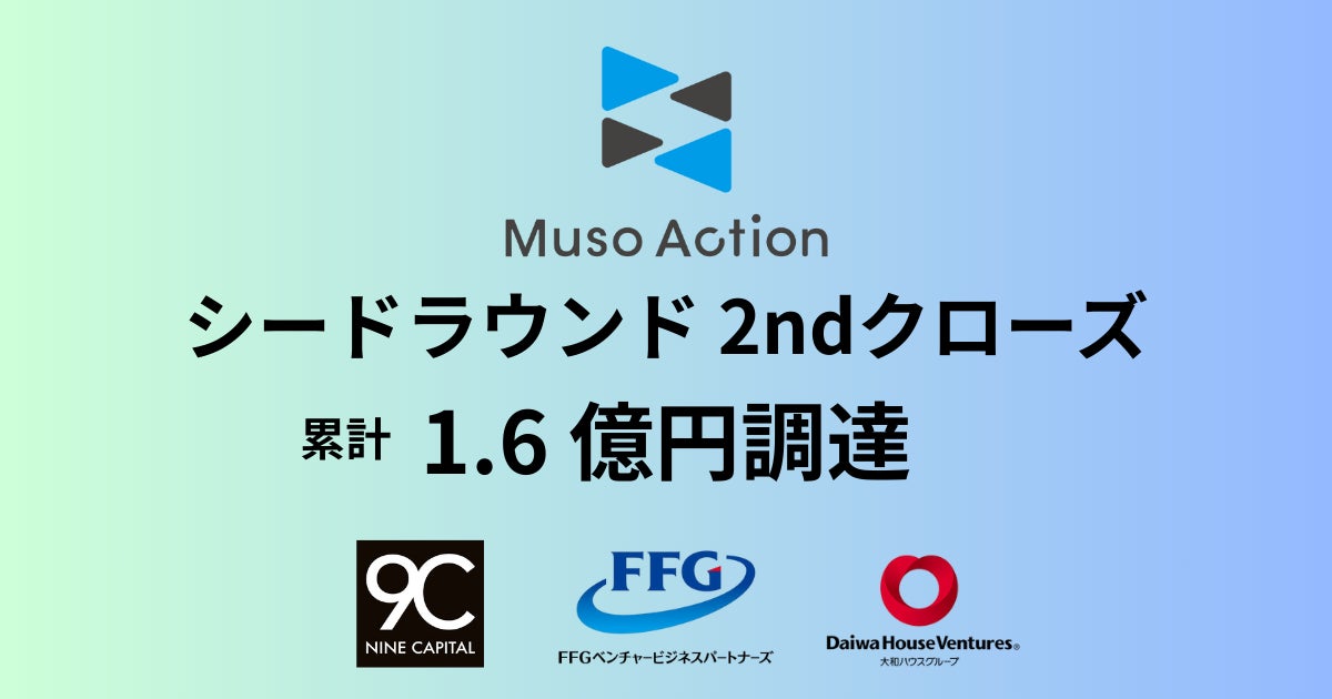 Muso Action株式会社(本社:東京都千代田区、代表取締役CEO:村山 龍太郎、以下「Muso Action」)は、シードラウンドのセカンドクローズにおいて、J-KISS型新株予約権による資金調達を実施し、創業融資を含めた累計資金調達額が総額1.6億円となったことをお知らせします。