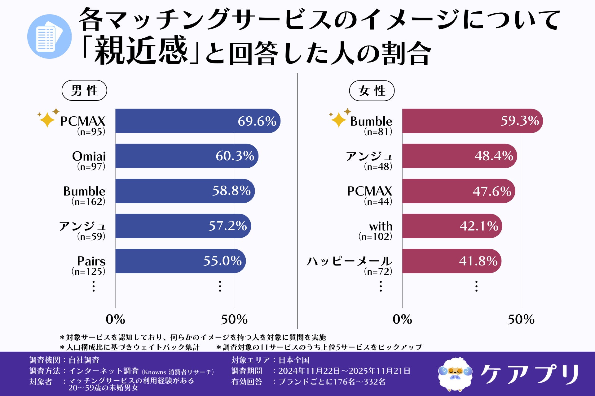 各ブランドについて「親近感」というイメージに当てはまると回答した人の割合は、男性では『PCMAX』が69.6%で最も高く、次いで『Omiai』が60.3%、『Bumble』が58.8%となりました。一方、女性では『Bumble』が59.3%で最も高く、次いで『アンジュ』が48.4%、『PCMAX』が47.6%という結果でした。