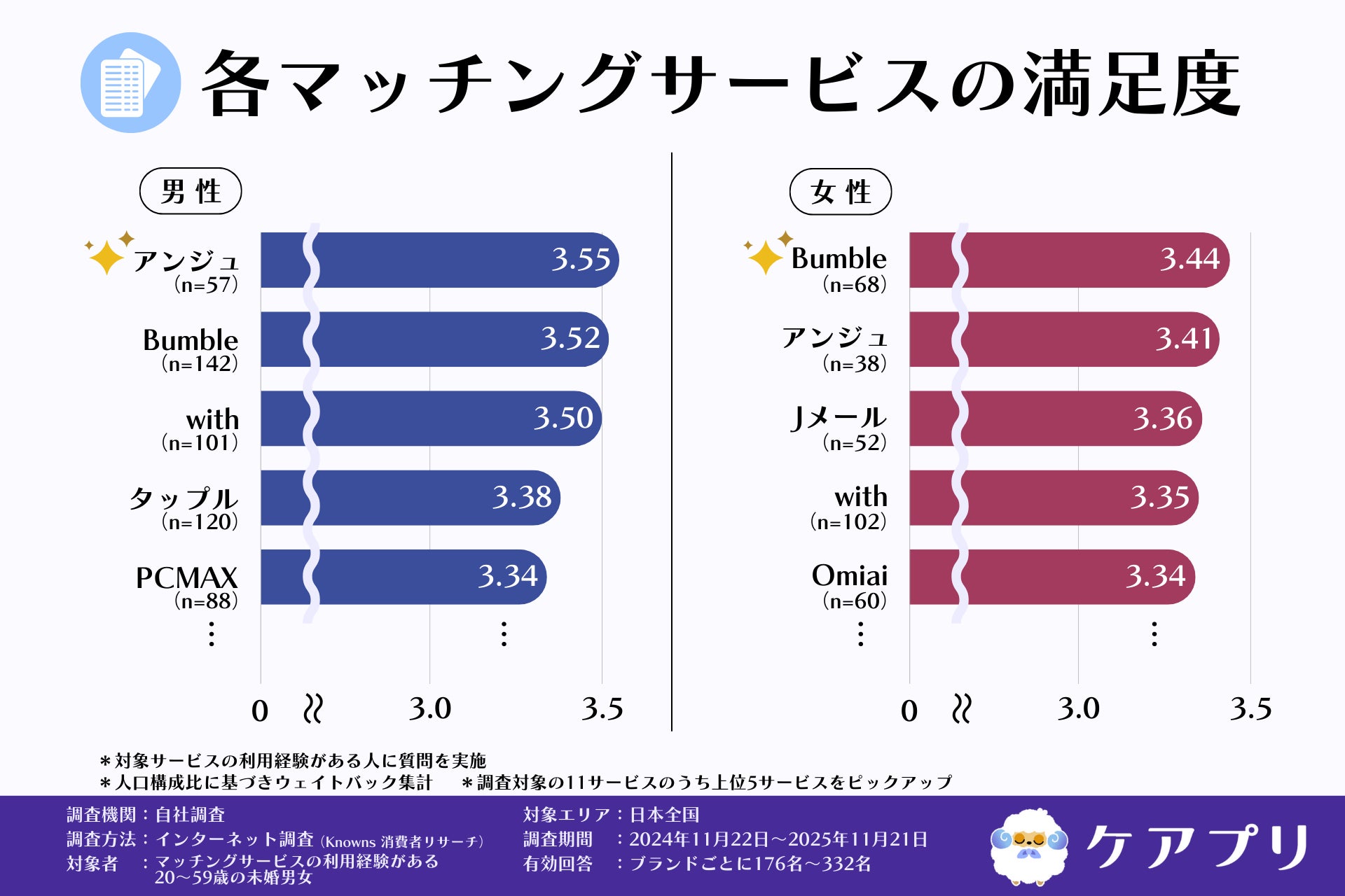 満足度の上位ブランドを見ると、男女ともに『アンジュ』と『Bumble』がトップ2を占めています。また、上位5ブランドは3.34~3.55の範囲で僅差で競り合っており、それぞれのサービスが利用者から一定の評価を得ていることが分かります。