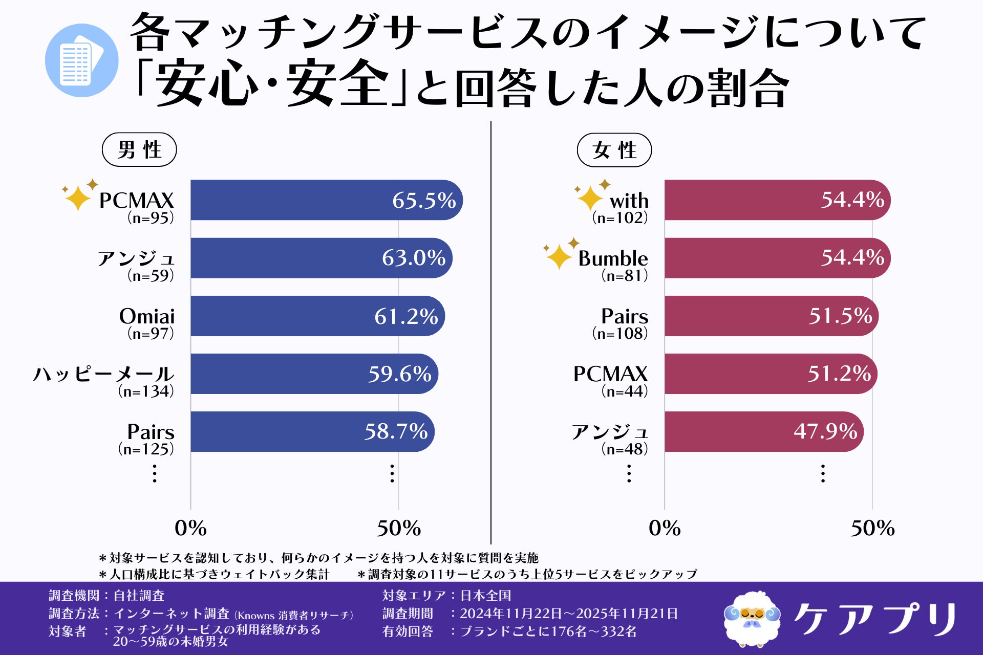 各ブランドについて「安心・安全」というイメージに当てはまると回答した人の割合は、男性では『PCMAX』が65.5%で最も高く、次いで『アンジュ』が63.0%、『Omiai』が61.2%となりました。一方、女性では『with』と『Bumble』が54.4%で最も高く、次いで『Pairs』が51.5%という結果でした。