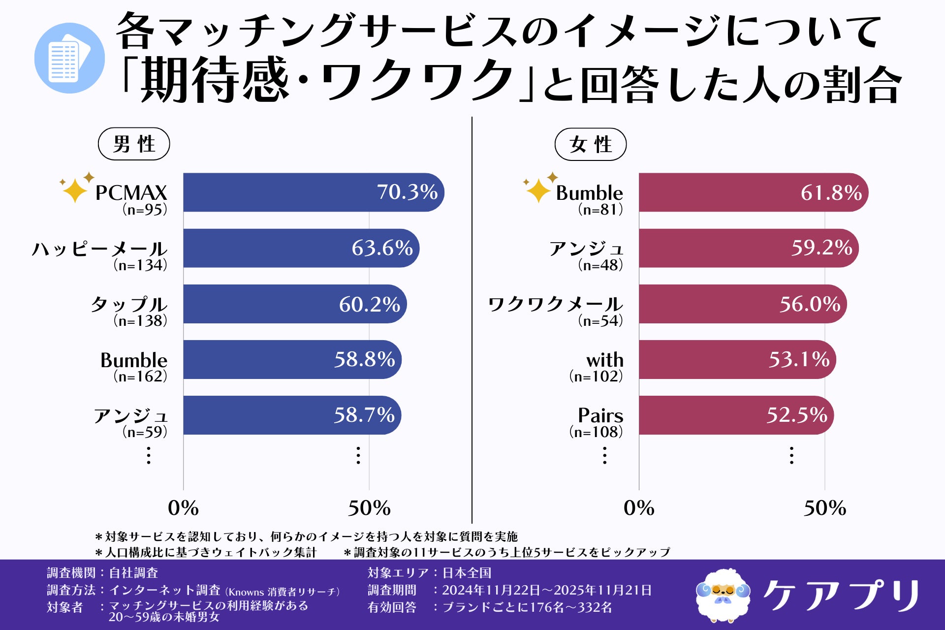 各ブランドについて「期待感・ワクワク」というイメージに当てはまると回答した人の割合は、男性では『PCMAX』が70.3%で最も高く、次いで『ハッピーメール』が63.6%、『タップル』が60.2%となりました。一方、女性では『Bumble』が61.8%で最も高く、次いで『アンジュ』が59.2%、『ワクワクメール』が56.0%という結果でした。