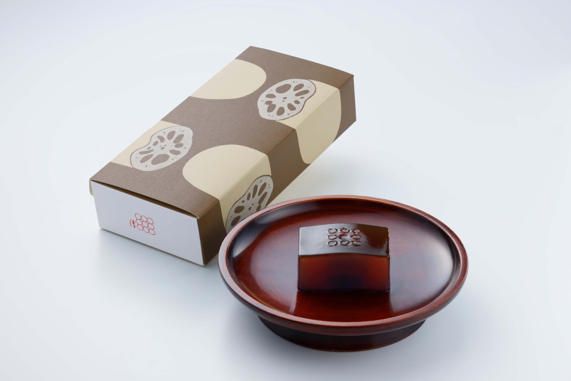 れんこんの根からとれる蓮粉と和三盆糖蜜を練り上げ、とろりとした口あたりとやさしい甘みを楽しめる、紫野和久傳の代表菓子。季節ごとに餡を加えた限定品も展開し、秋冬は「栗餡」を販売いたします。