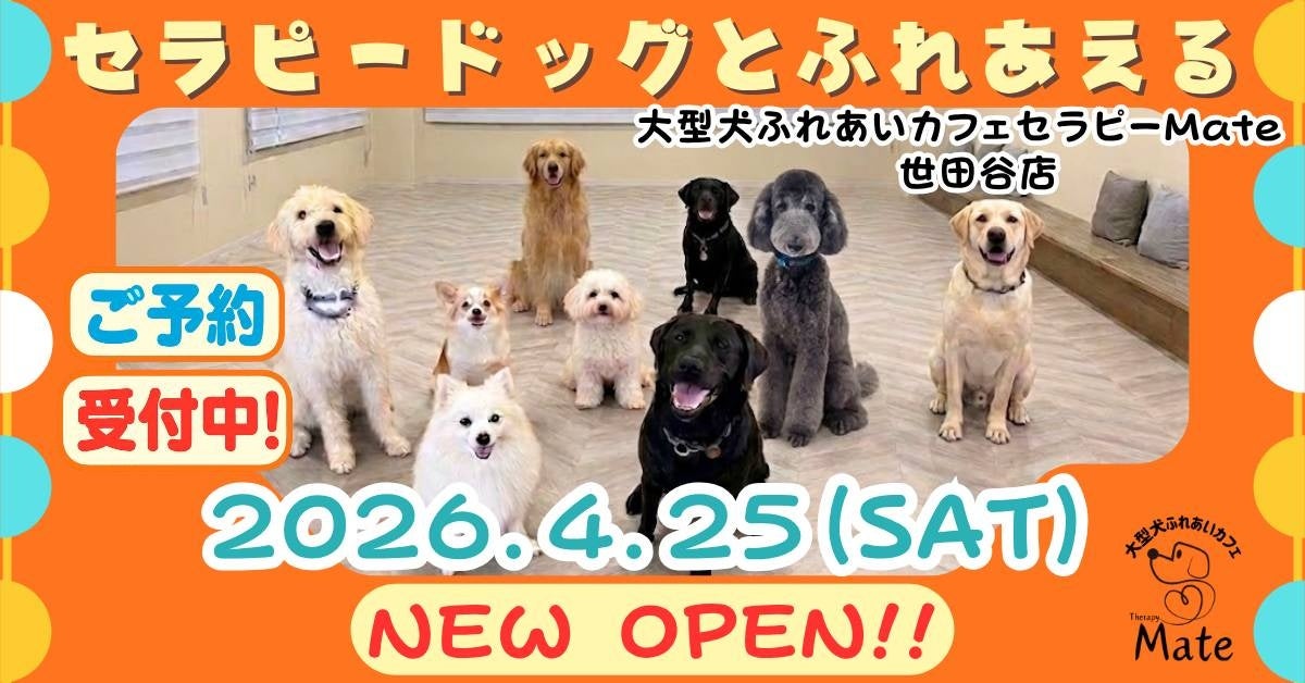 大型犬とのふれあいを通じて心のケアと地域交流を提供する「大型犬ふれあいカフェ“セラピーメイト”」は、2026年4月25日、世田谷区の介護施設に併設された地域交流施設内に「セラピーメイト世田谷店」をオープンいたします。