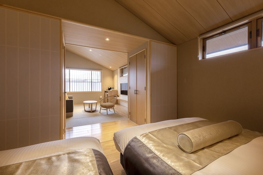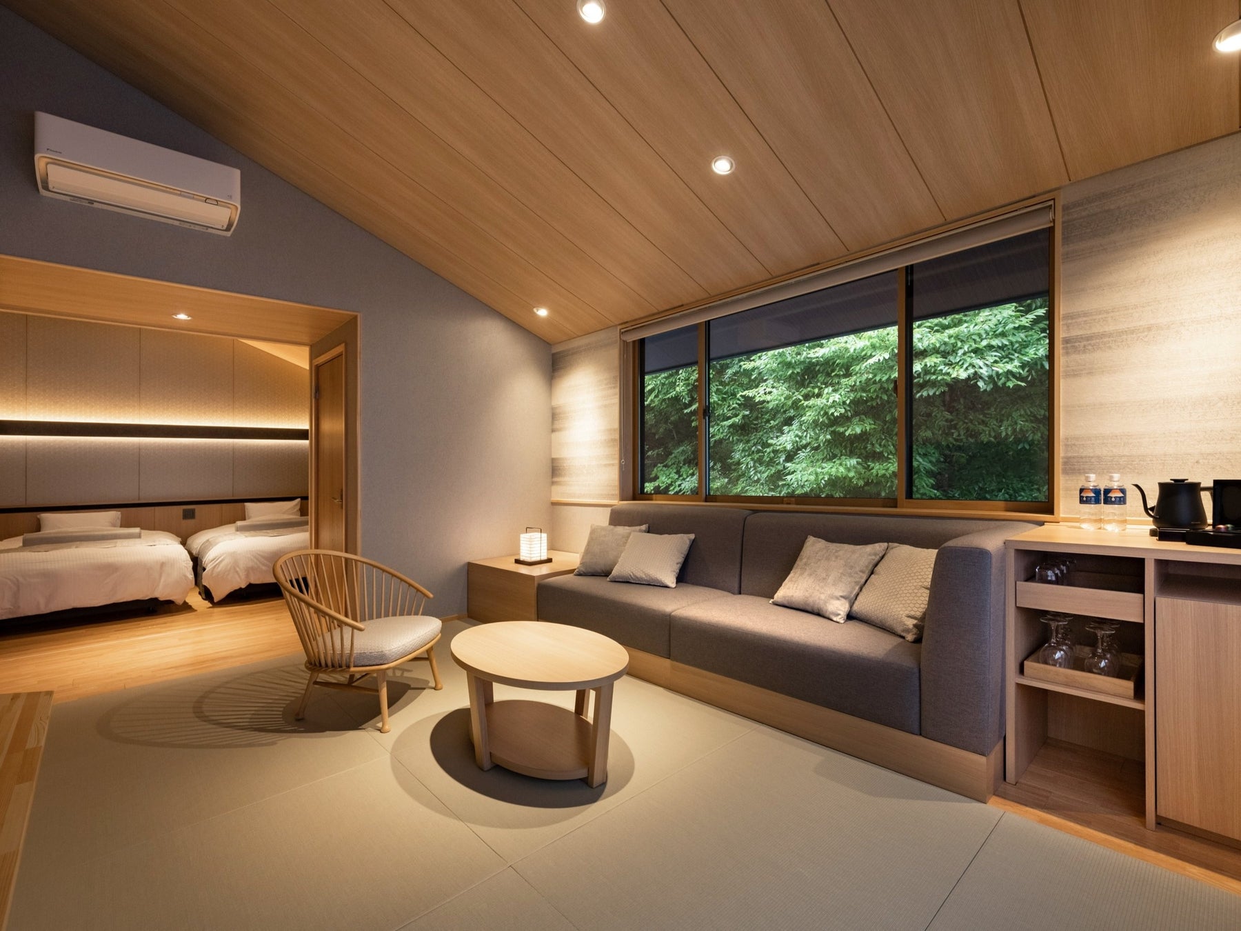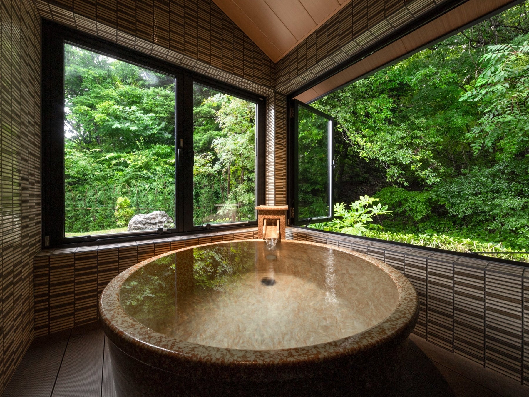 各室には専用の玄関、食事処、茶の間、寝室、露天風呂、専用庭園を備え、
