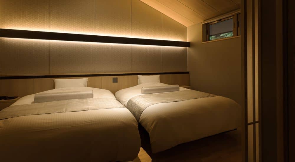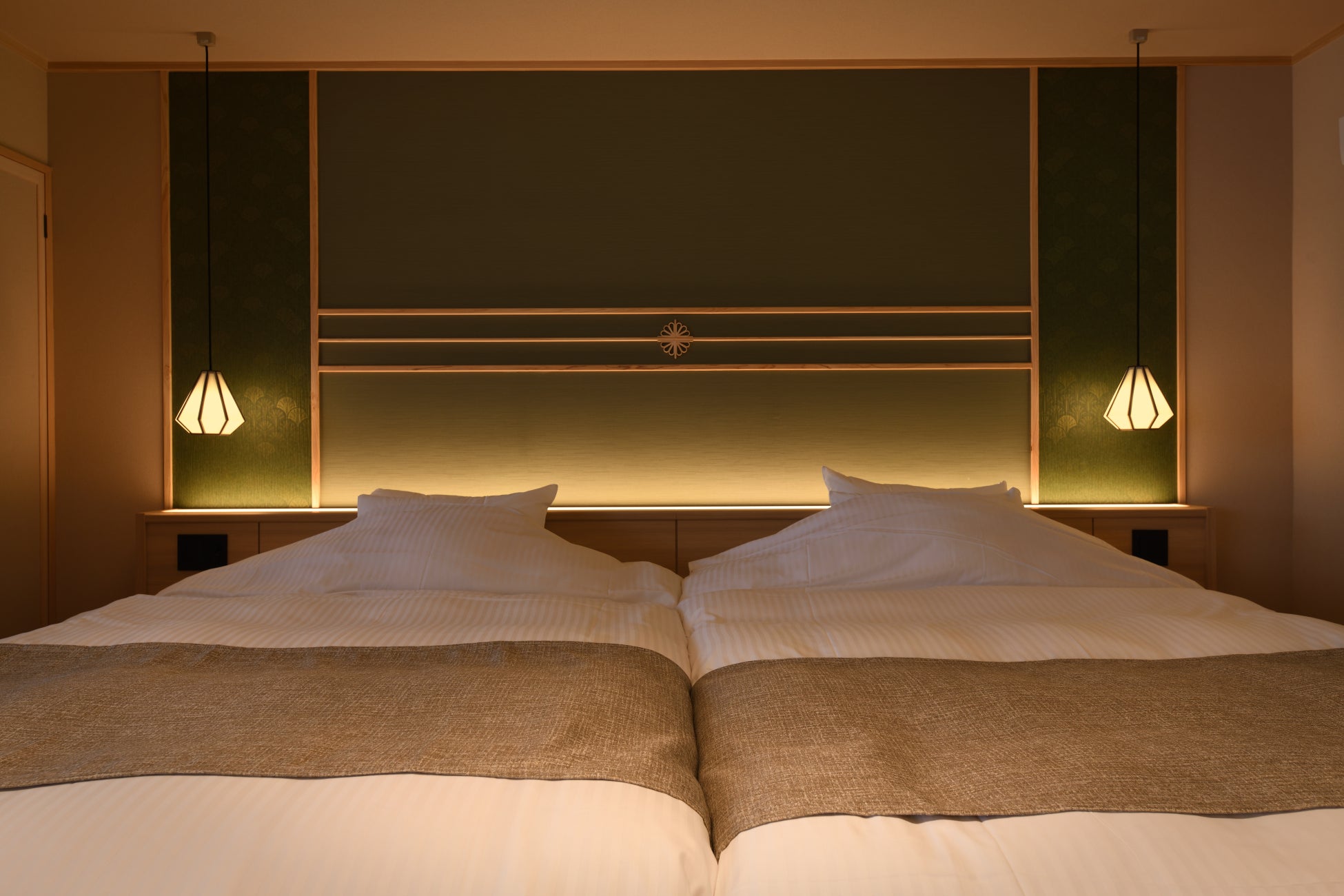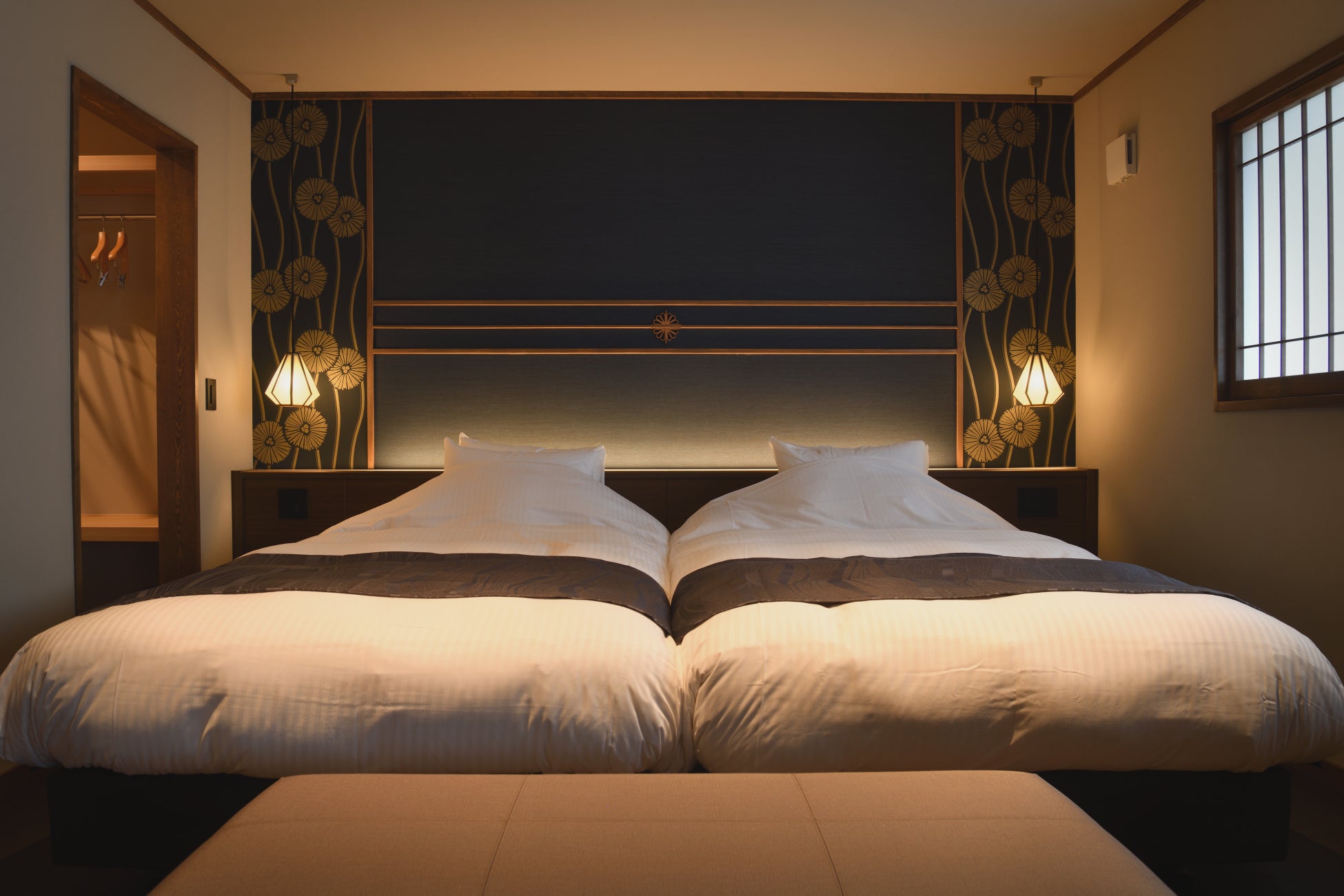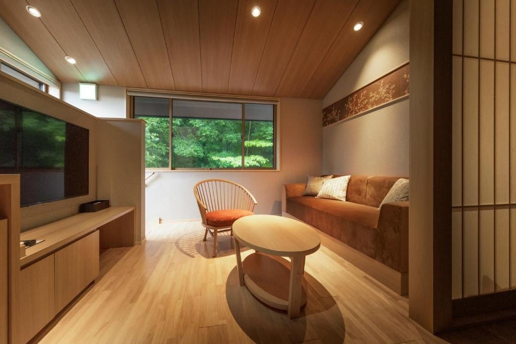 各室には専用の玄関、食事処、茶の間、寝室、露天風呂、専用庭園を備え、