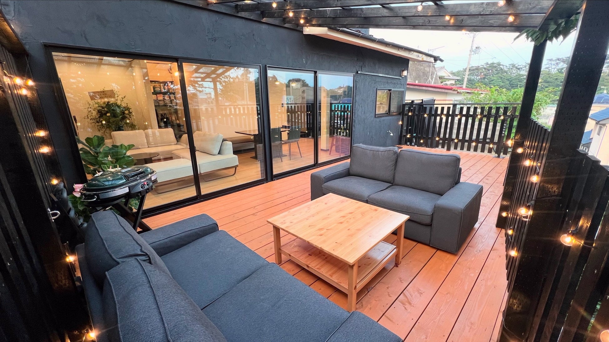 雨の日でも安心の広々した屋根付きウッドデッキを備え