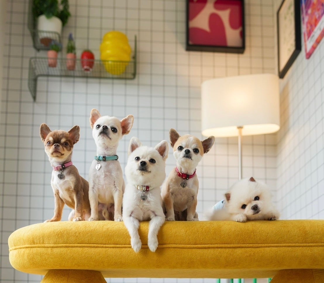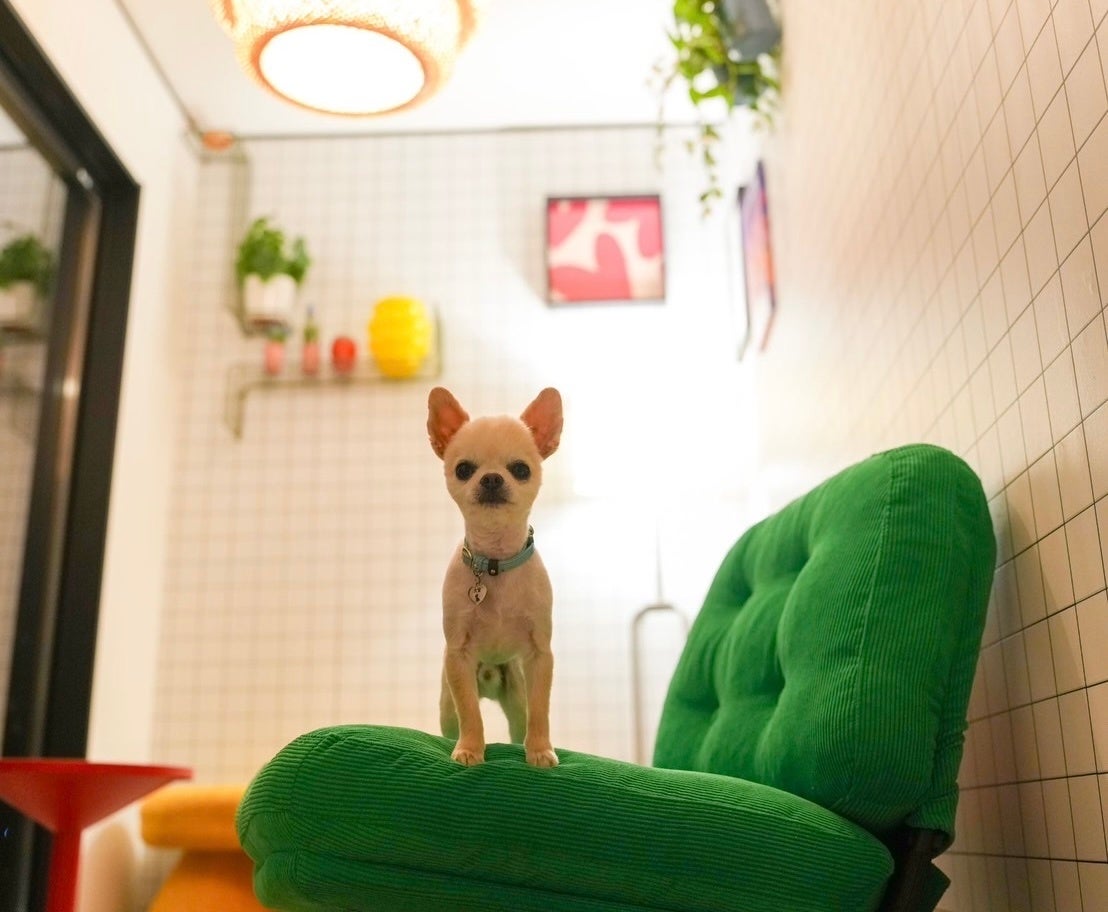 ラウンジには目を引くカラフルでポップな家具が並び、遊び心ある小物とともに、愛犬との大切な時間を過ごすことができる。
