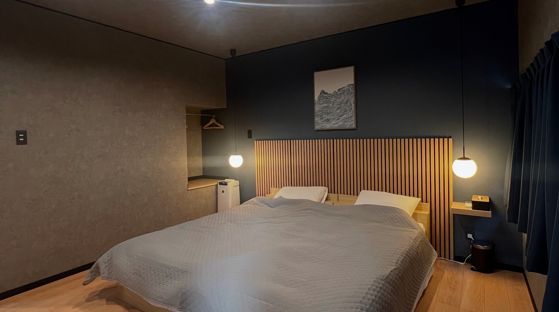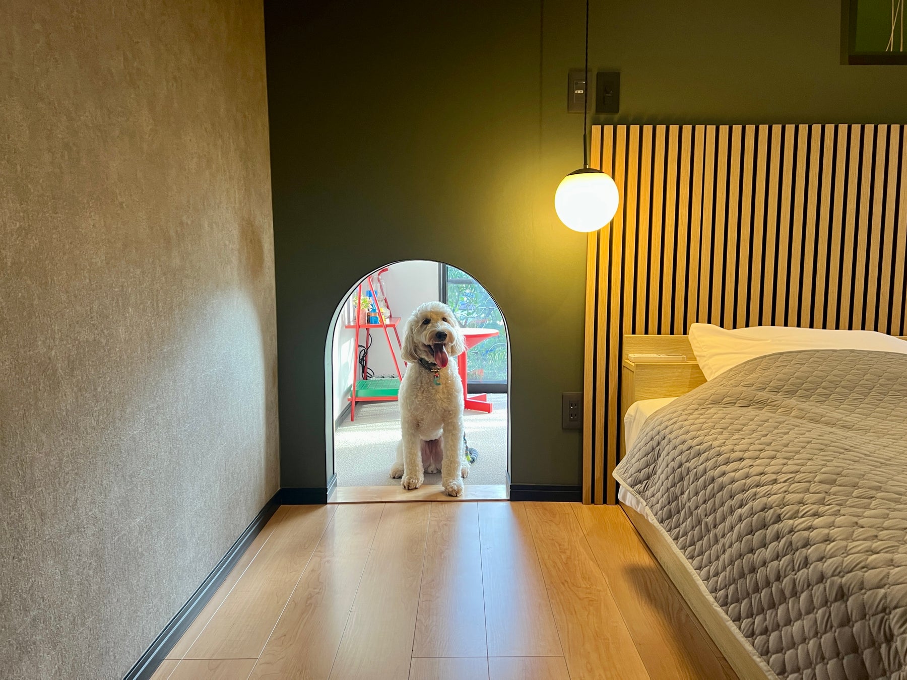 松島をモチーフにした「MATSU」と「UMI」2つの寝室は愛犬と一緒に寝られるようローベッドを採用。