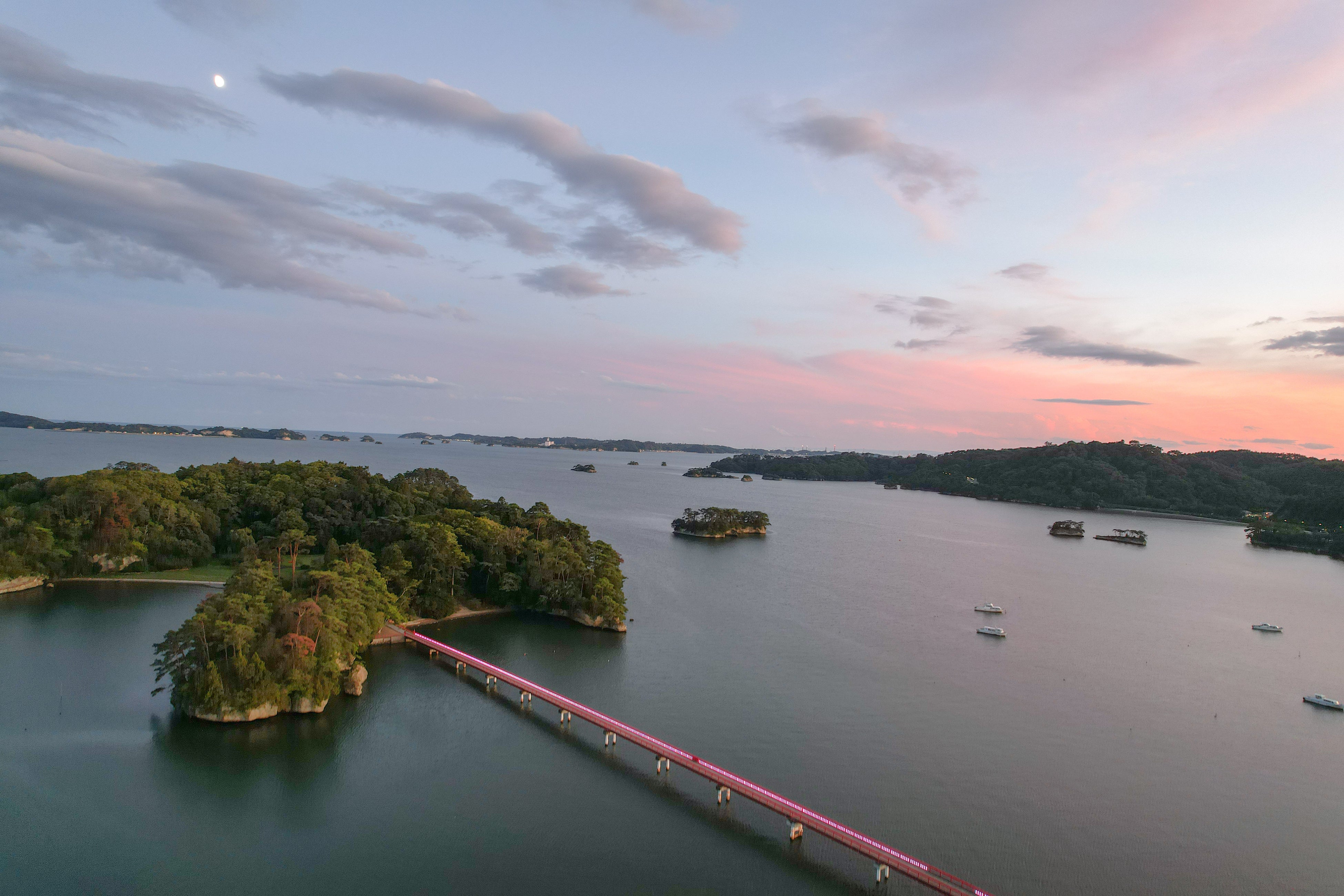 日が落ちる頃には、松島湾に浮かぶ島々が夕陽に染まり、昼間の喧騒とはまるで別世界の風景が広がる。人のいない松島を、ゆっくりと独り占めする贅沢な時間が流れる。