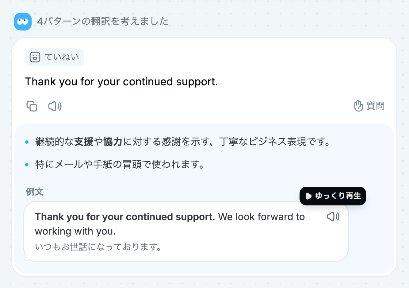 複数の翻訳案をシーンとトーンに合わせて提示(例:カジュアル / フォーマルなど)