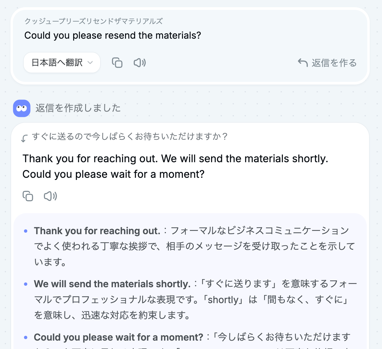 従来の“1入力=1訳”の翻訳ツールとは異なり、複数の言い回しの提案に加え、AIによりニュアンスや使い分けの解説までチェックすることができます。翻訳後には、原文と同じ言語でAIにより返信文を作成することもできます。
