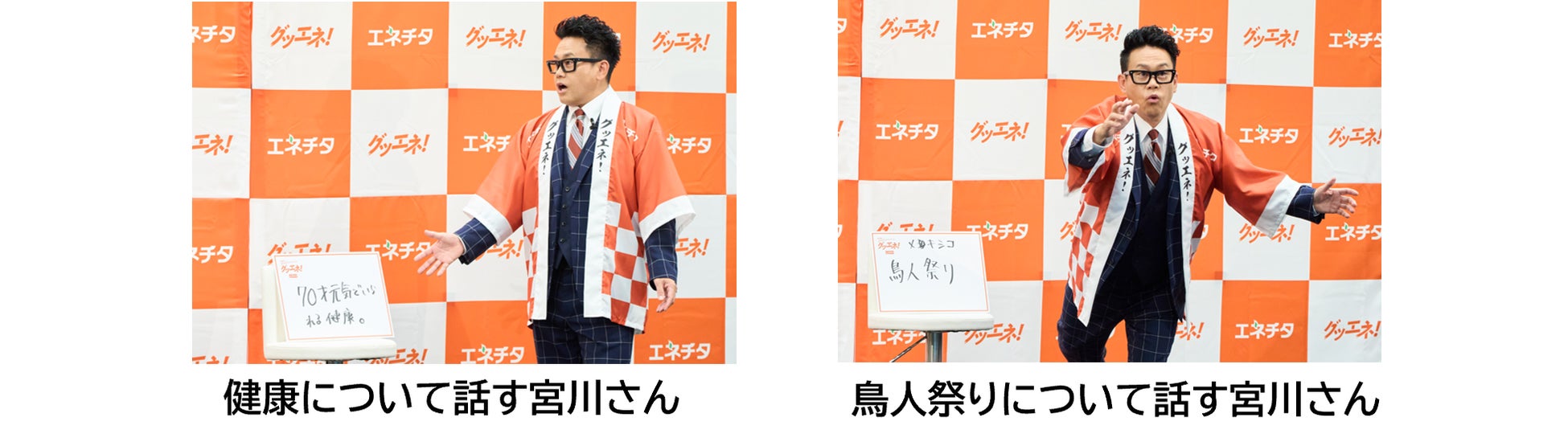 宮川大輔さんを起用した理由について、「エネチタの社員は、いつも一生懸命、全力で明るく仕事に取り組んでいます。テレビで拝見する宮川さんも、体を張って一生懸命取り組まれる姿が印象的で、エネチタのイメージにぴったり」と説明し、宣伝部長就任をお願いしたことを明かしました。