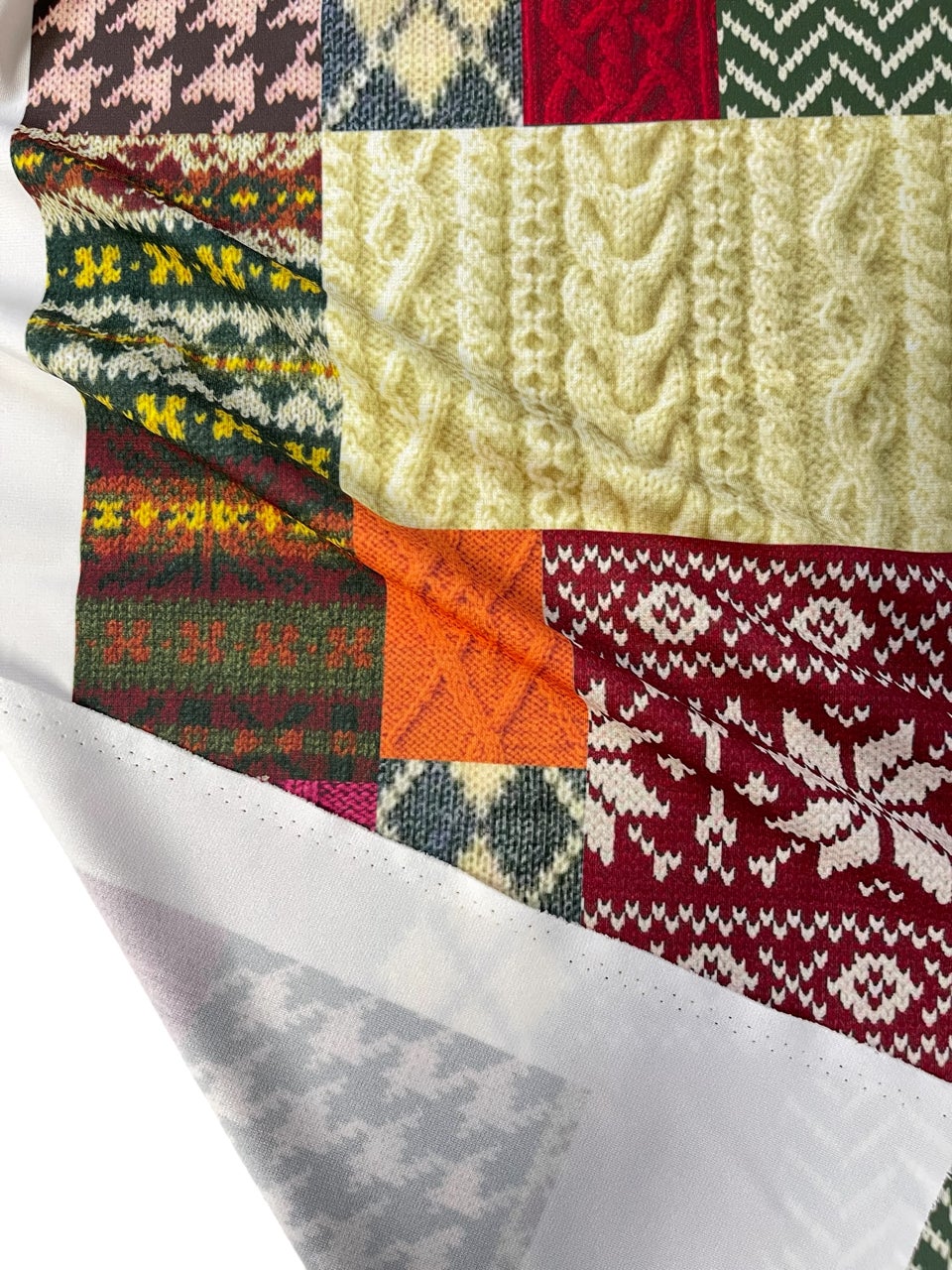 昨今の温暖化の気候に対応しつつ、秋冬の気分を楽しめるように、ニットの柄をお手入れが簡単なジャージ素材にプリントした