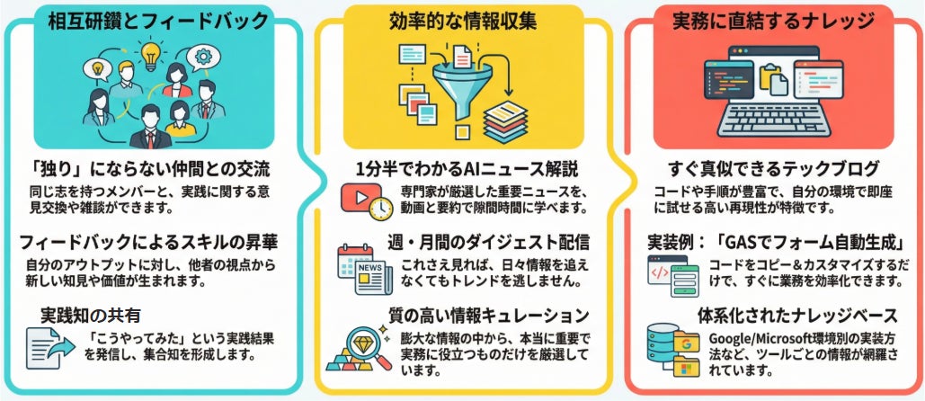 実践の知(実務に直結するナレッジ):コードやプロンプトを網羅した「再現性の高いテックブログ」を提供。DifyやCopilot Studio等を用いた具体的な実装例を共有し、検証コストを大幅に削減します。