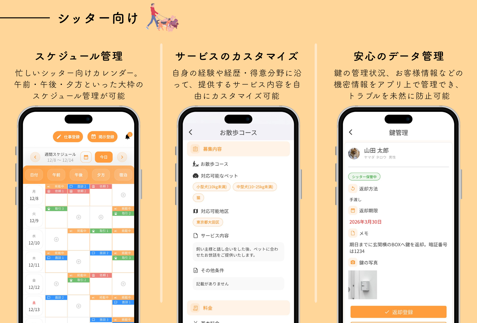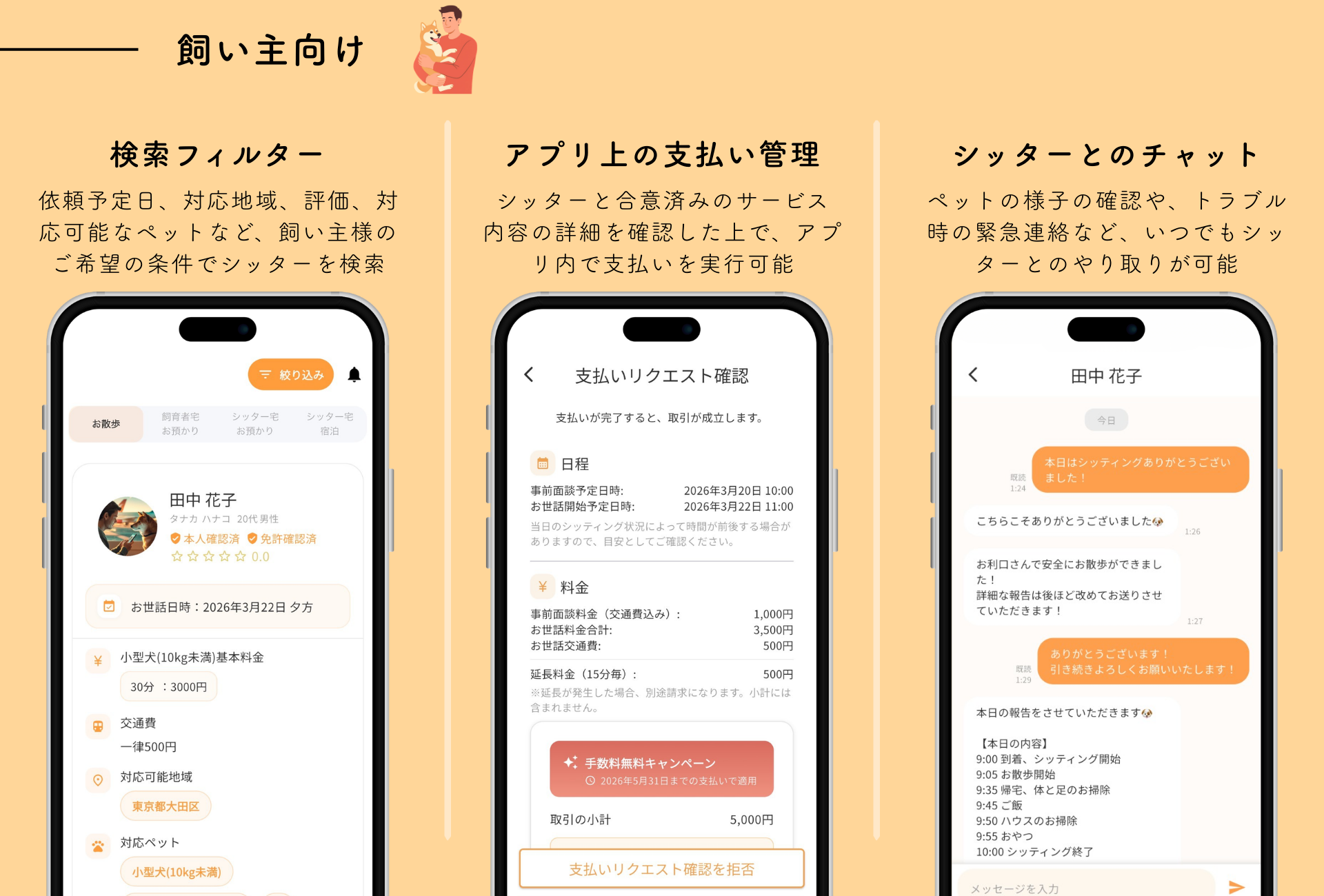 飼い主向け :シッター検索・予約、チャット、口コミ/評価、細かいペット情報の登録・共有