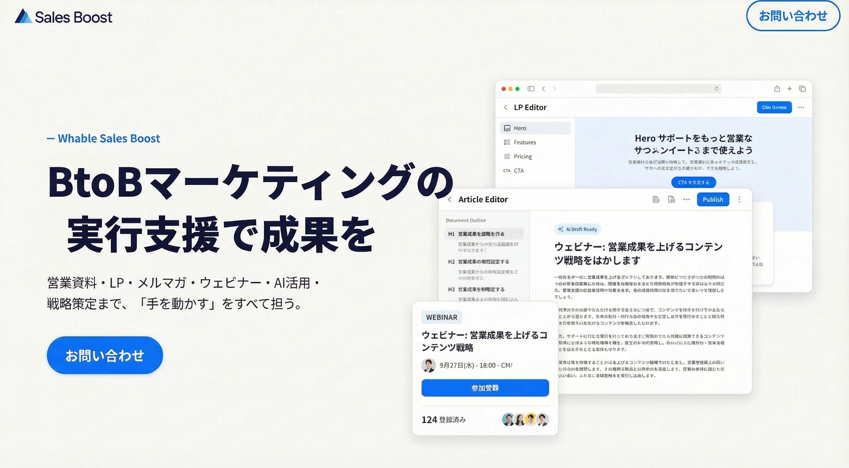株式会社Whable(ウェイブル)は、BtoB企業の「なぜ売れたのか」を掘り起こし、営業の属人化を解消する会社です。独自AIアプリで営業ナレッジが自然に蓄積される基盤をつくり、その知識をもとに営業資料・コンテンツの制作から運用まで一気通貫で実行します。