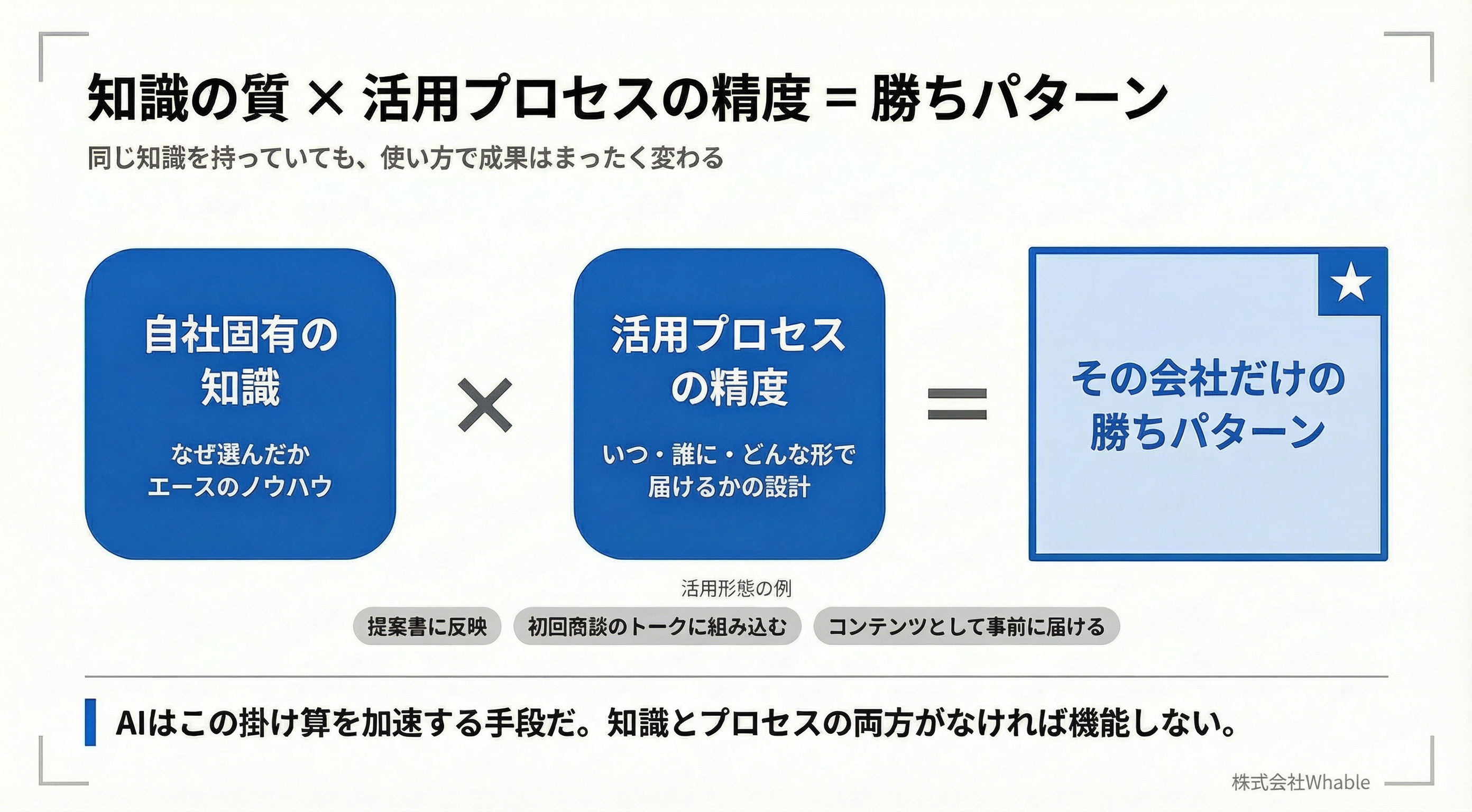 知識の質 × 活用プロセスの精度。この掛け算が、その企業だけの勝ちパターンをつくります。AIはこの掛け算を加速させる強力な手段です。自社固有の知識を発掘し、AIを活用して成果につなげるプロセスを作り込むことが企業の競争力になると考えています。