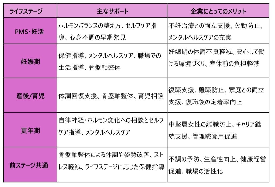 助産師による“ライフステージに寄り添うケア”を通じて、企業が実現できる健康経営の形として、以下の表に女性のライフステージ別ケア内容と企業にとってのメリットを示します。