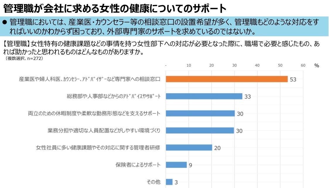 経済産業省が推進する「健康経営優良法人」の認定企業は年々増加し、企業の健康経営への関心は高まりを見せています。しかしながら、女性特有の健康課題への対応はまだ十分とは言えません。経済産業省の調査では、女性従業員の健康課題で最も多いのは「メンタルヘルス」。また、管理職の53%が「産業医や婦人科医、カウンセラーなど専門家への相談窓口の設置」を求めており、企業が専門的な支援体制を必要としている現状が見えてきます(図1)