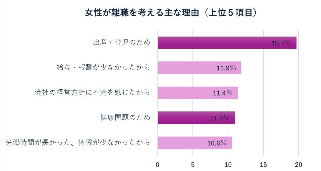 一方、厚生労働省の調査(図2)では、女性の離職理由の上位に「出産・育児のため」「健康問題」が並び、職場での女性支援の重要性が浮き彫りになっています。