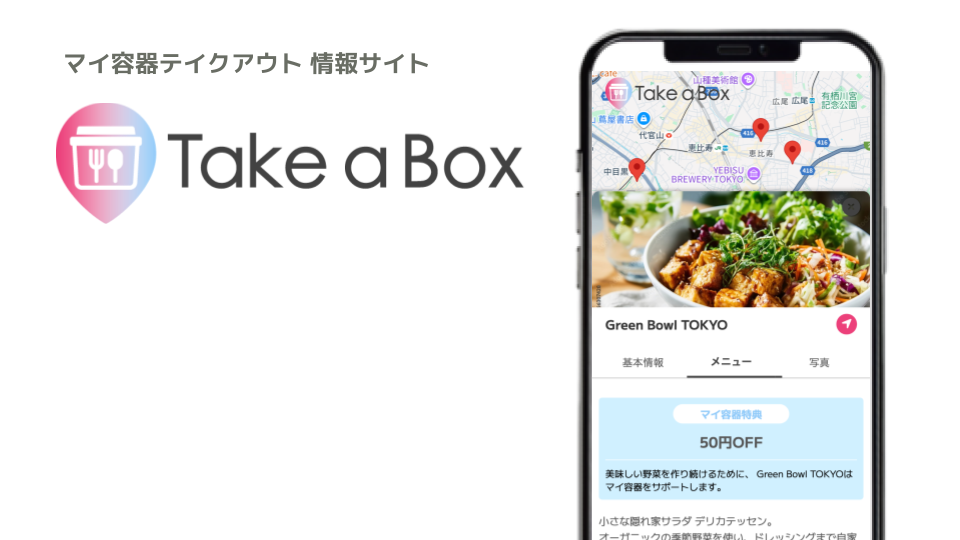 また、近くのマイ容器対応店が探せる情報サイト「Take aBox」も運営しています。