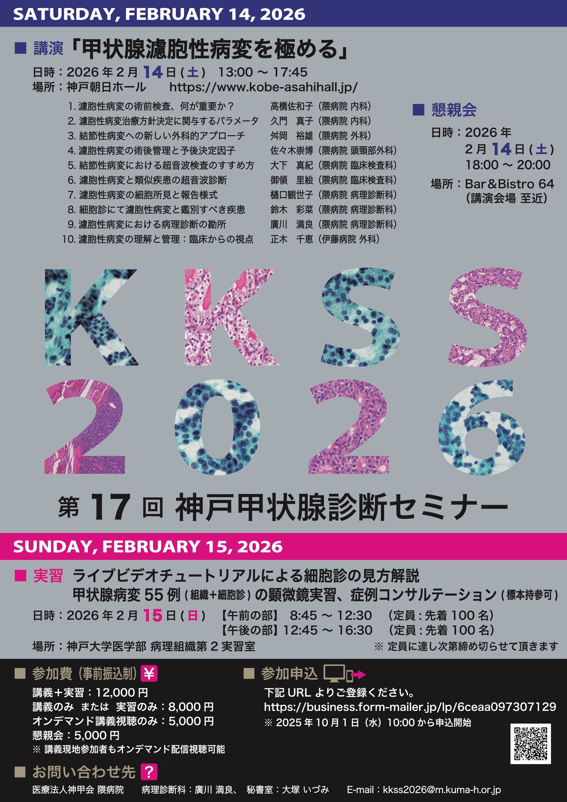 この度、医療法人神甲会 隈病院(所在地:兵庫県神戸市)は、2026年2月14日(土)・15日(日)の2日間、「第17回神戸甲状腺診断セミナー」を開催いたします。本セミナーは、甲状腺診断に関わる多職種の医療者を対象に、最新の知見と実践的スキルを学ぶプログラムです。2026年度より、現地開催に加えて講義のオンデマンド配信も実施し、より多くの医療従事者に学びの機会を提供いたします。現在、参加申込を受け付けておりますので、この機会に是非ご参加ください。