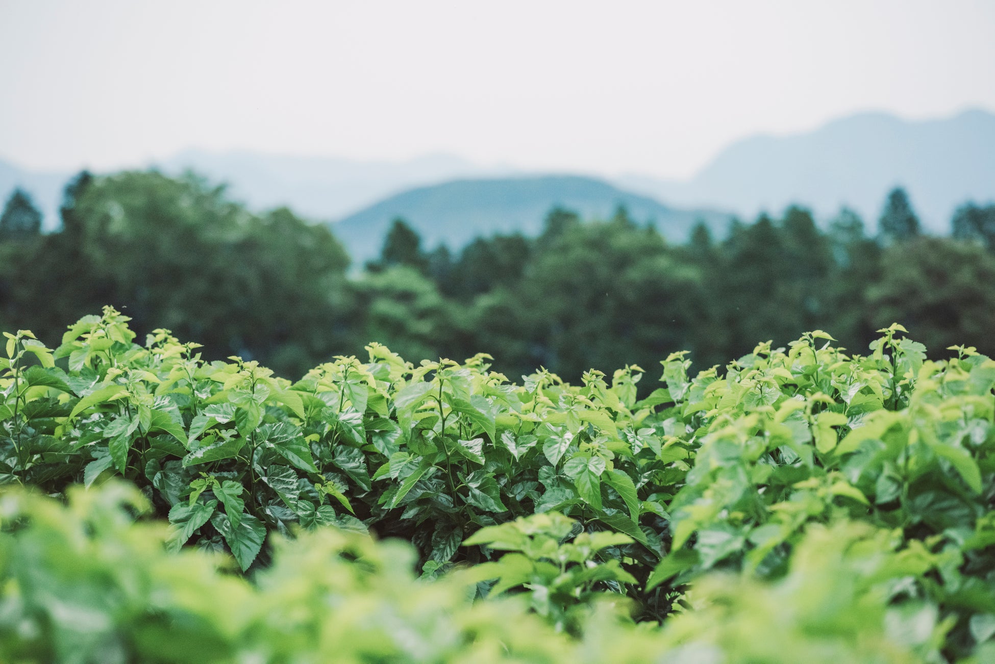 「やまがシルク」を紡ぐカイコが食べるのは、熊本県・山鹿市で独自に栽培している無農薬の桑葉で作った人工飼料。そのため、標高600メートルの山頂に農地面積約25ヘクタールの巨大桑園「天空桑園」を造成し、およそ8万本の桑を無農薬栽培しています。カイコは農薬の影響を非常に強く受けますが、平地から桑園まで遠く離れていることで、ほとんど農薬の影響を受けずにカイコにやさしい オーガニックな桑の葉を育てることが可能です。また、「天空桑園」は長年耕作放棄地として荒れ果てていた農地を甦らせて再生しており、山鹿市の遊休地・耕作放棄地の解消にも貢献しています。