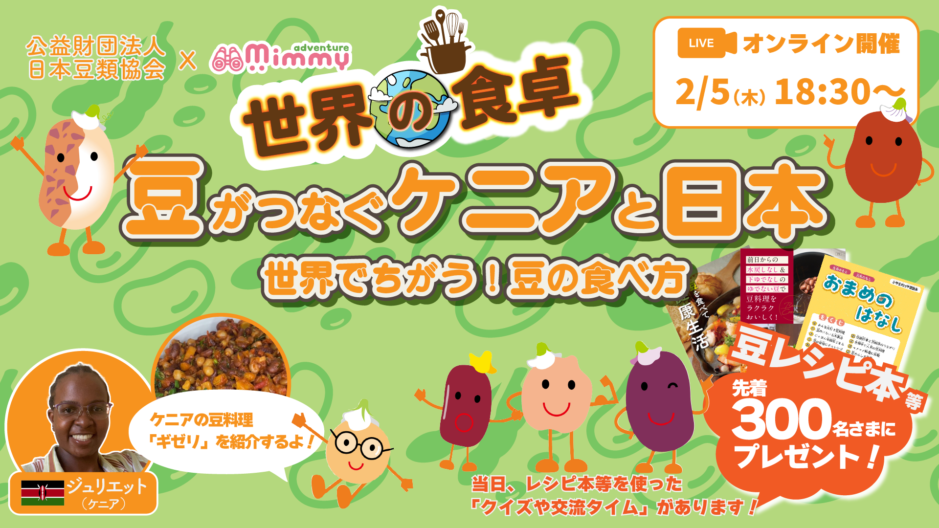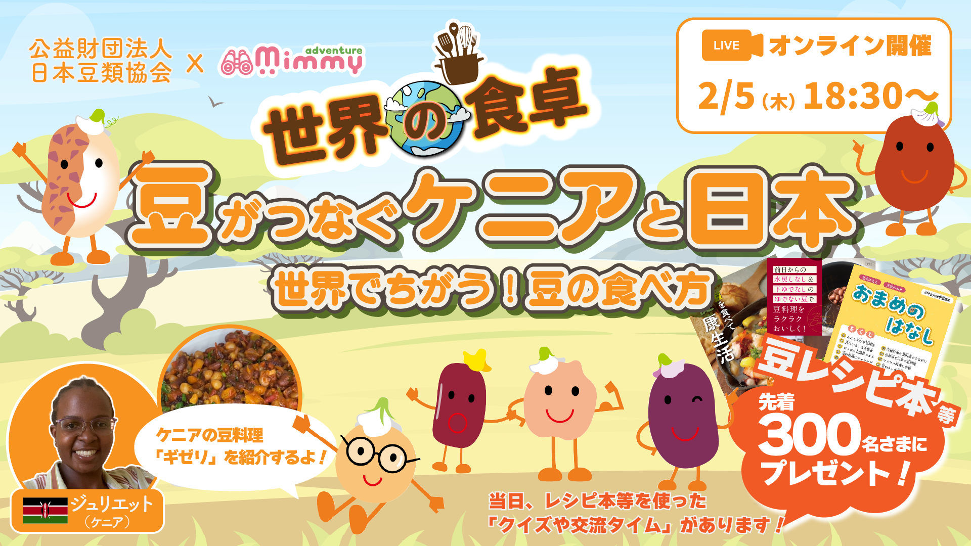 「学びの圏外をなくす」をビジョンに掲げ 、公立小学校や大手企業向けに体験型コンテンツを提供する株式会社Mimmy(本社:東京都渋谷区、代表取締役:守屋 亮、以下「当社」)は、公益財団法人 日本豆類協会と連携し、日本とケニアをつなぐ食育イベント「世界の食卓:ケニアの豆アドベンチャー」を開催します。
