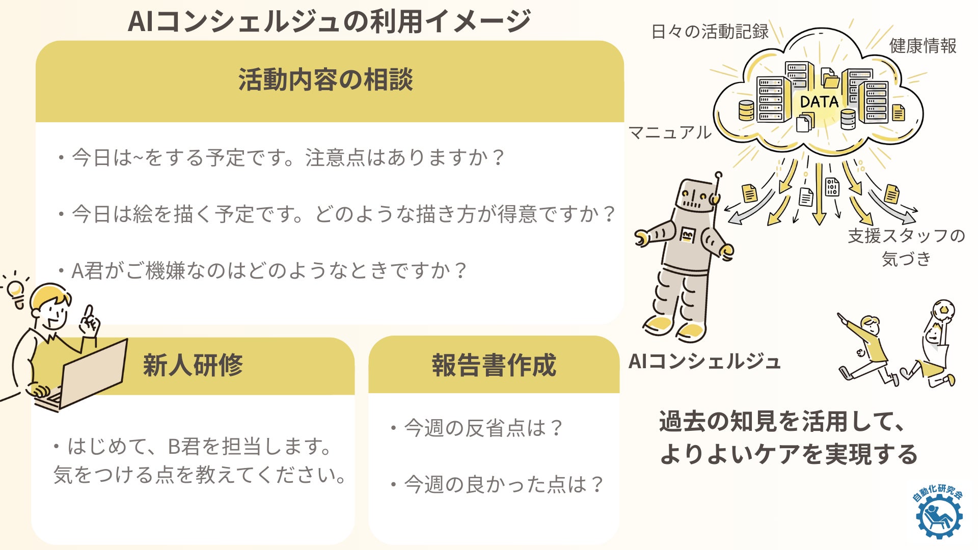 自動化研究会とUBUNTUは、福祉現場に特有の情報と配慮事項を踏まえ、チャットベースで福祉業務支援ができるAIコンシェルジュ(仮称)を共同で設計、検証します。