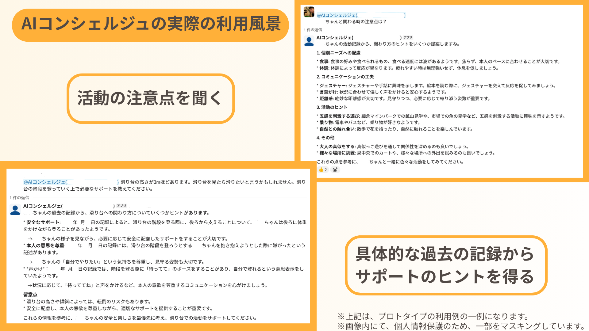 今回、UBUNTUが活用しているSlackや他サービスに蓄積された日報、活動記録、マニュアル、個別メモ等を活用し、AIコンシェルジュ(仮称)を施設でのスタッフや補助員、新人が利用することで、より効率的に、各子どもたちに適した活動ができるようになることを目指します。それに加え、新人研修、活動報告書の作成など障がい児施設での業務全般を補助できるかを検証します。