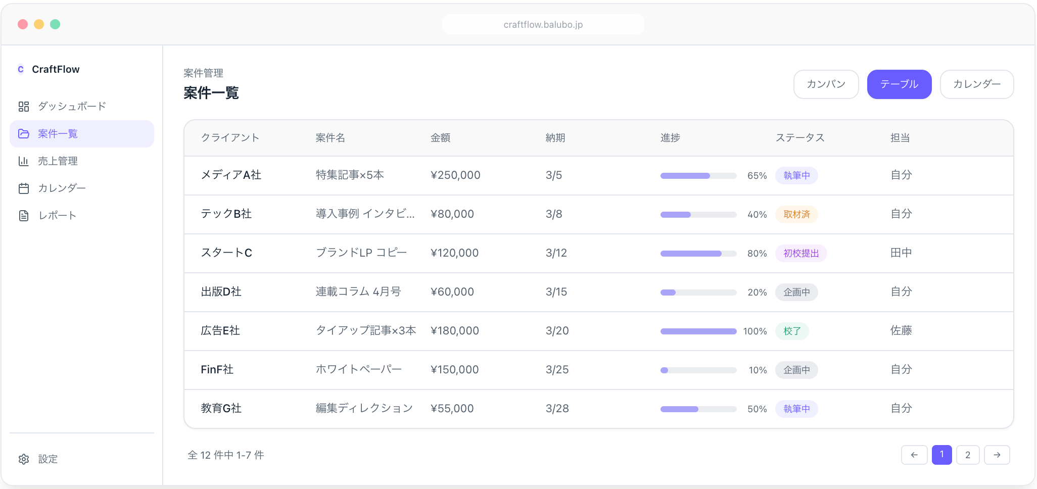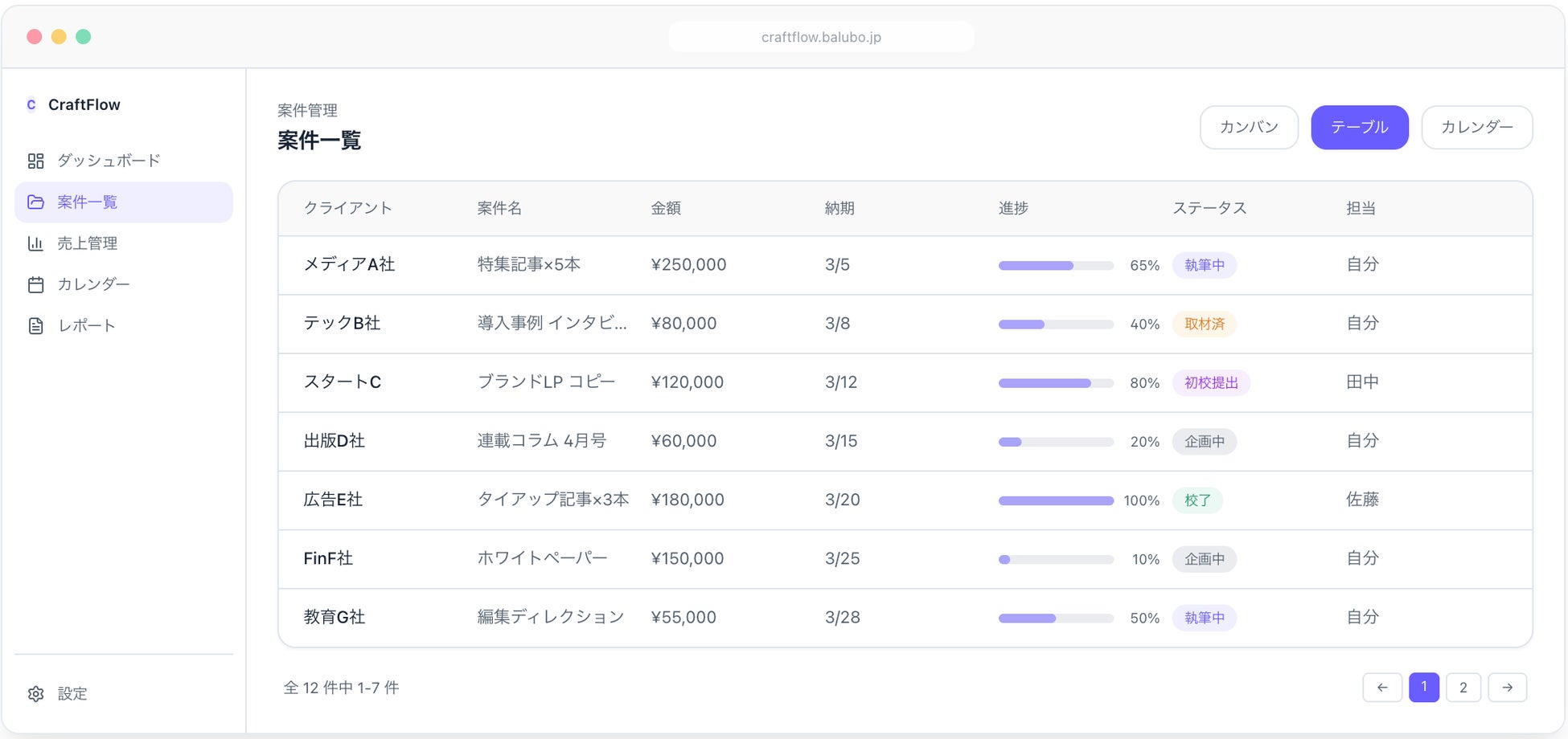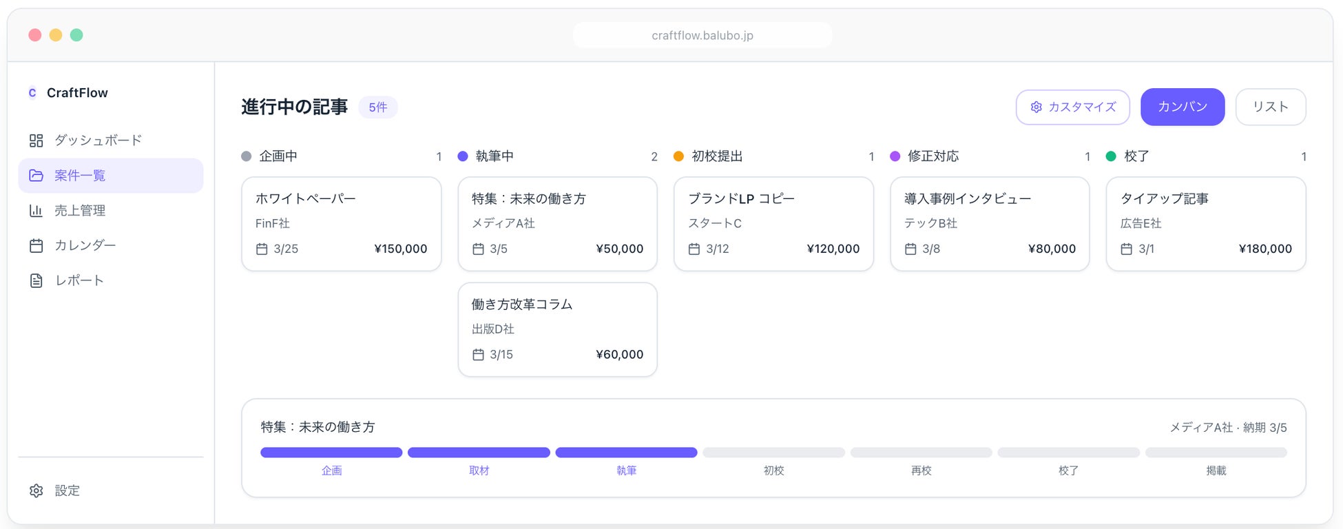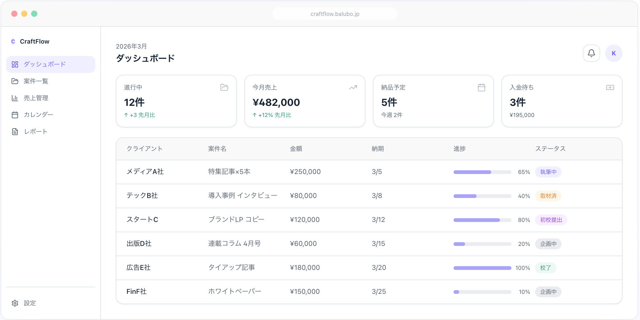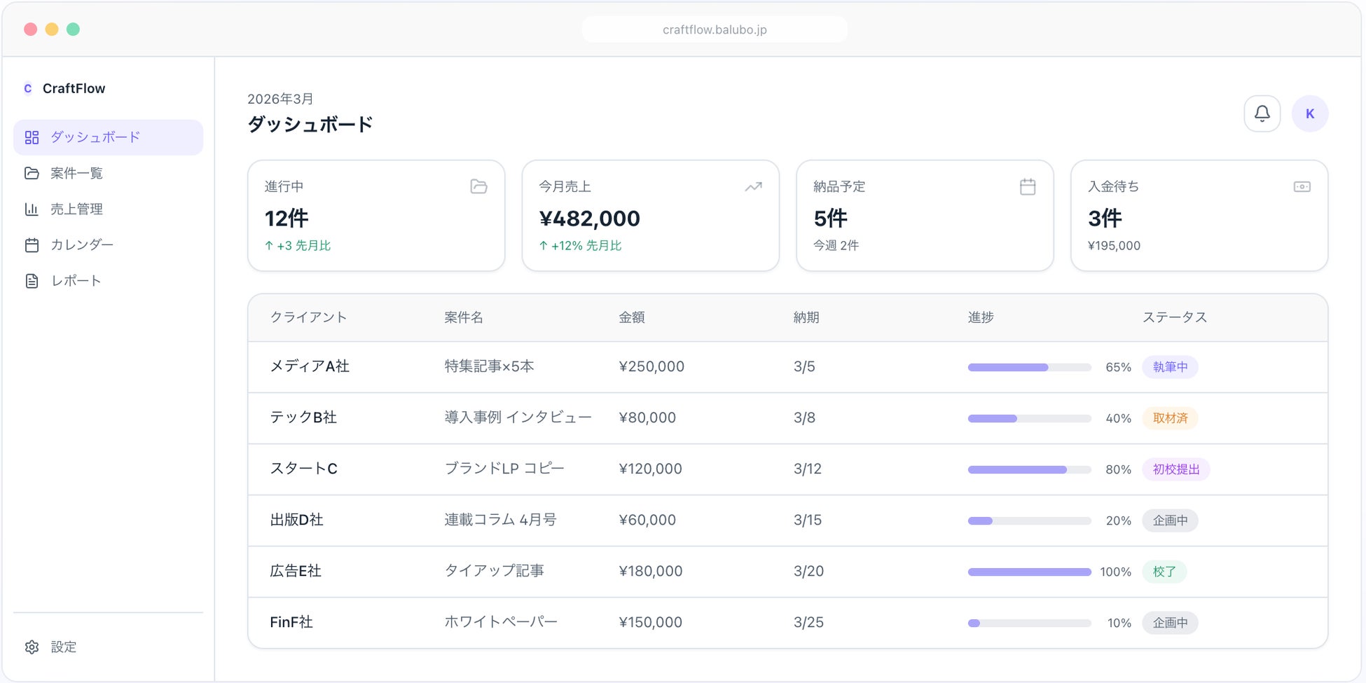 株式会社balubo(本社:東京都渋谷区、代表取締役:君和田郁弥)は、フリーランスのライター・編集者向けの案件・売上管理ツール「CraftFlow(クラフトフロー)」を2026年3月25日にリリースしました。