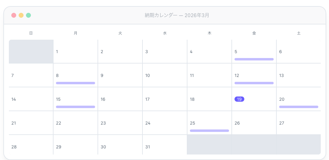 CraftFlowに登録した案件の納期がGoogleカレンダーに自動で反映されます。