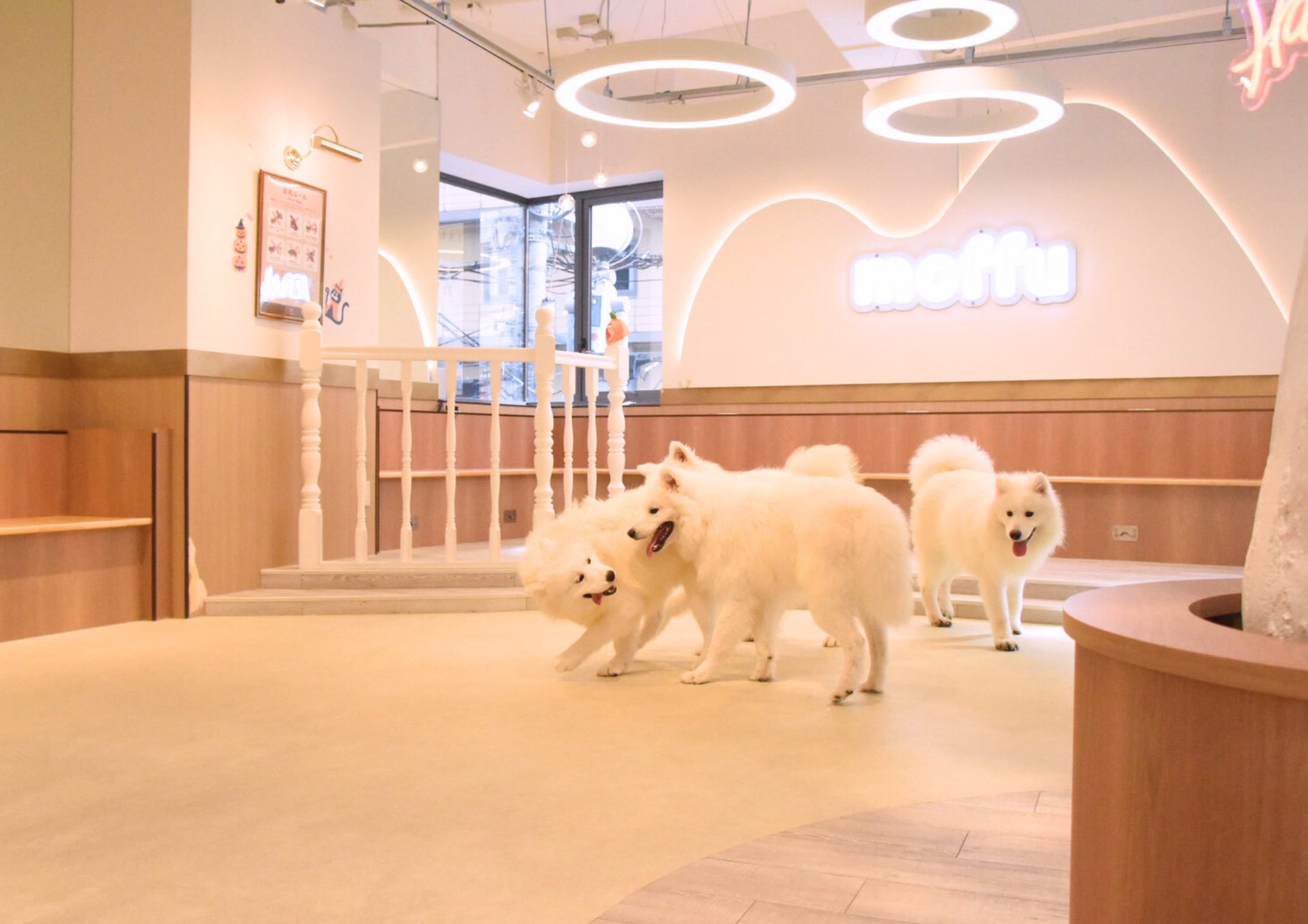 サモエドカフェmoffuは、真っ白で人懐っこい大型犬サモエドたちと触れ合える体験型カフェです。