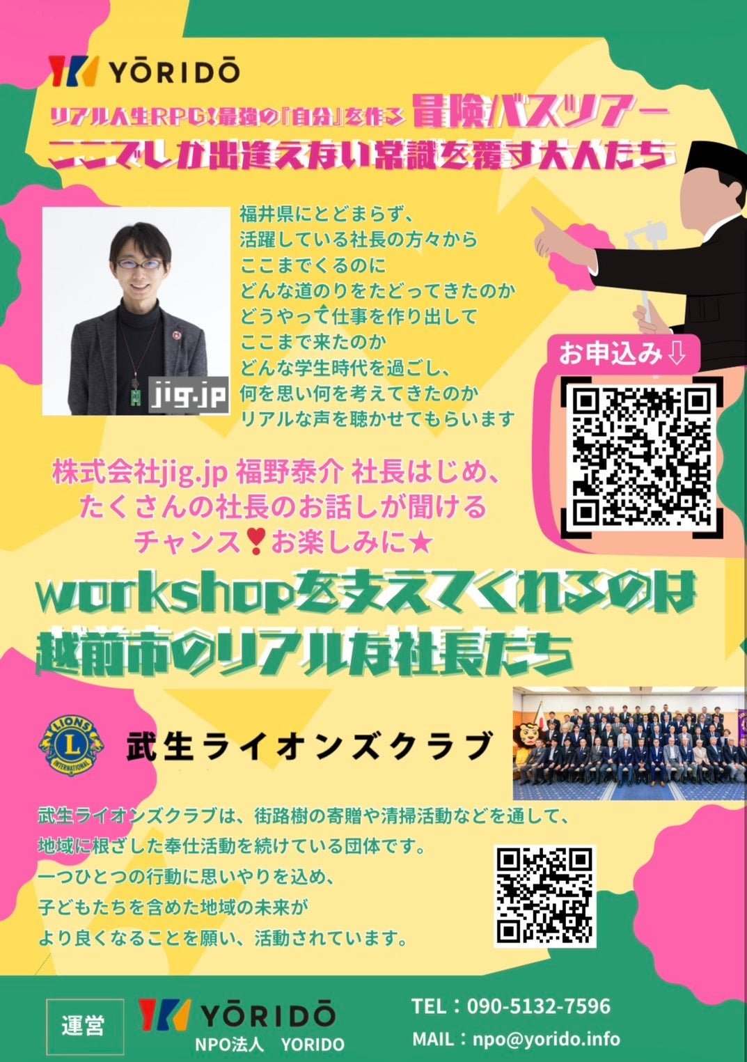 NPO法人YORIDO(所在地:福井県、代表:洞雞真人)は、武生ライオンズクラブとの共催により、2026年3月22日(日)に福井県内の新小学5年生〜新中学3年生を対象とした1日完結型の体験プログラム「リアル人生RPG!最強の『自分』を作る 冒険バスツアー」を開催いたします。 本企画は、子どもたちが福井を牽引する経営者たちとの対話を通して「自分で考え、決断する力(=社長の視点)」を養う実践的なワークショップです。体験格差の是正を目的とし、ひとり親家庭優先枠などを設け、昼食込み・参加費1,000円で実施いたします。