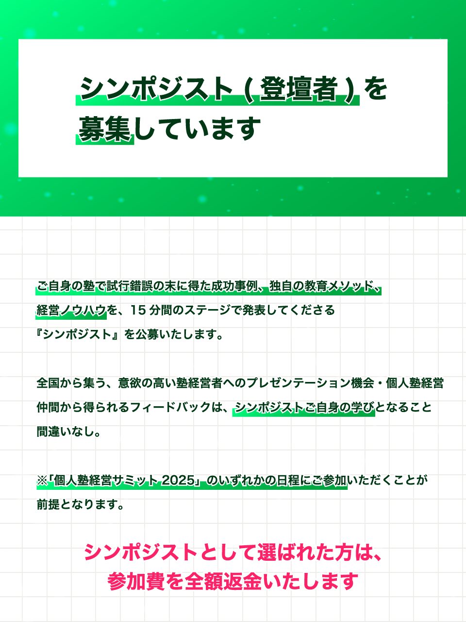 ✅選抜シンポジストは「歴代シンポジスト」として、次回以降の「個人塾経営サミット」は参加費が永年無料となります。