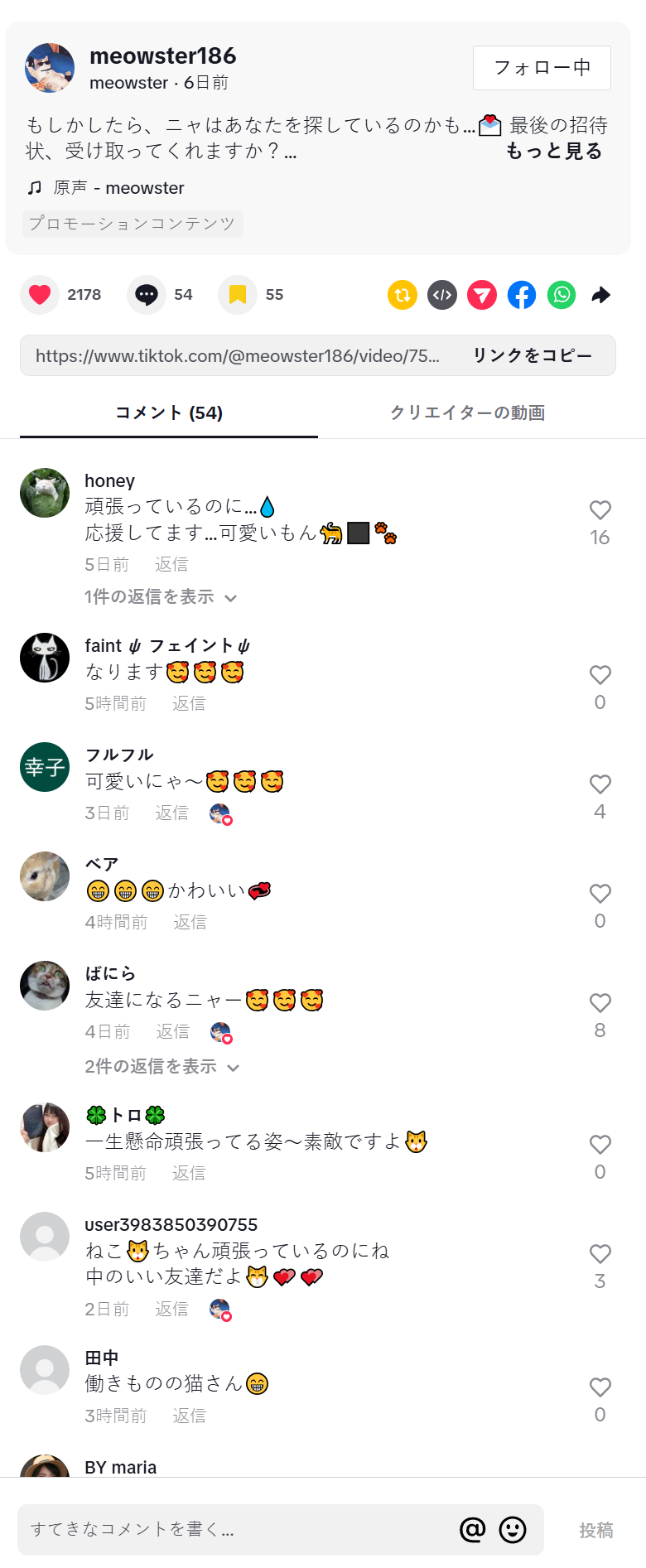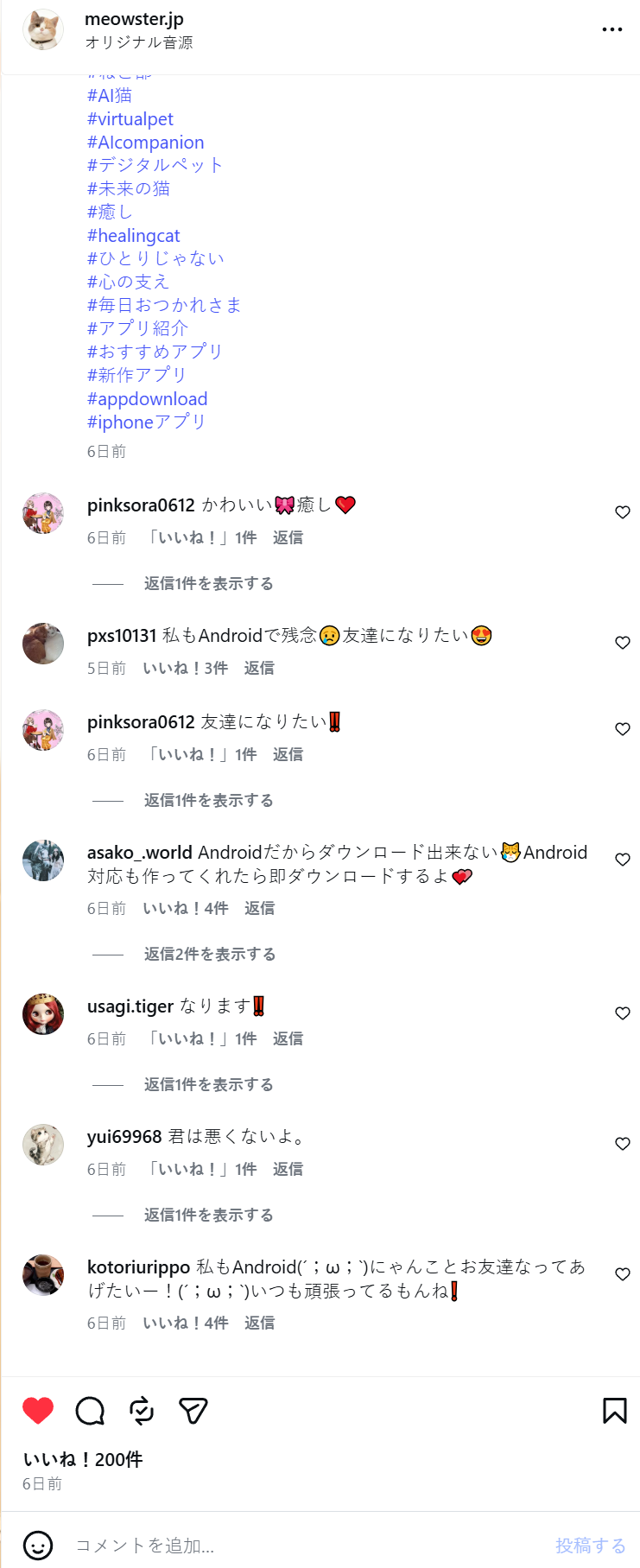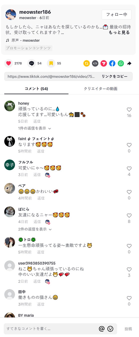 初回リリースから数日間で、Meowster公式のTikTokおよびInstagramには、温かなコメントが数多く寄せられました。たとえば——
